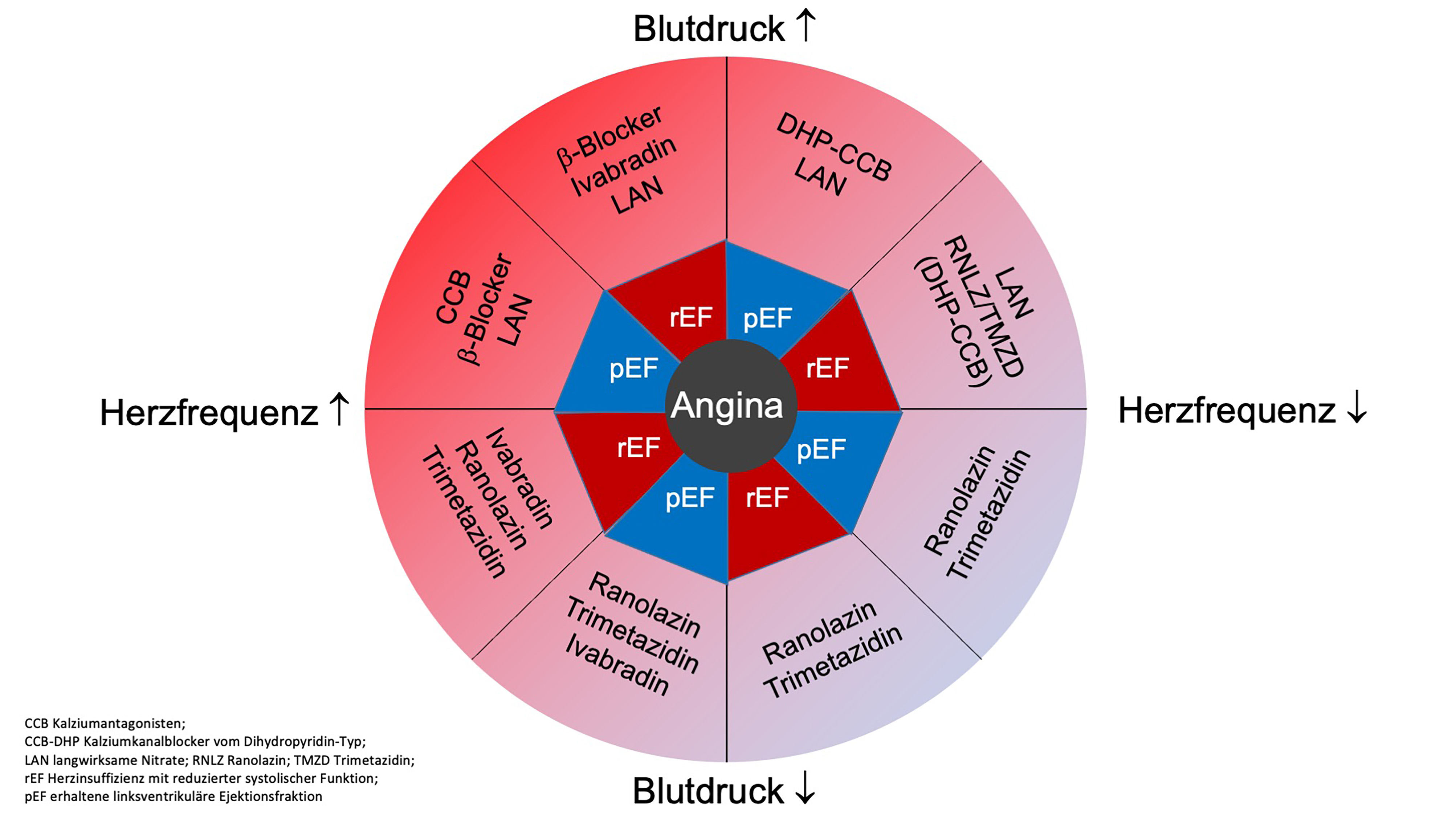 Wichtige Parameter des Kompasses sind Blutdruck und Herzfrequenz. Hier sind nicht nur die hohen Werte relevant, sondern auch die normalen und niedrigen. Die Kombination sei entscheidend, so Maack. Ist der Blutdruck höher als 140 zu 80 mmHg, und liegt die Herzfrequenz über 70 Schlägen pro Minute, werden zum Beispiel Betablocker und Nitrate empfohlen, bei reduzierter Herzleistung kann neben Betablockern auch Ivabradin gegeben werden, bei erhaltenem Auswurf sind Kalziumantagonisten ratsam. Bei niedrigem Puls und Blutdruck bietet sich die Einnahme von Ranolazin und Trimetazidin an.