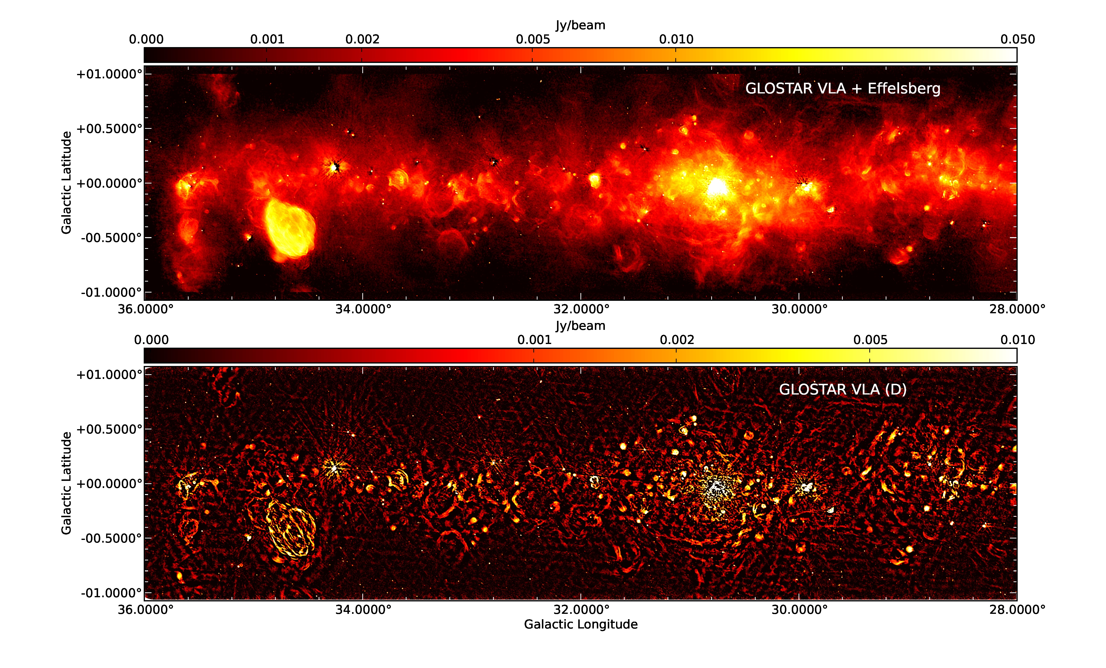GLOSTAR, die "Global View on Star Formation in the Milky Way"-Kartierung nutzt breitbandige (4-8 GHz) C-Band-Empfänger des VLA und des 100-m-Radioteleskops Effelsberg, um eine unverfälschte Kartierung von Sternentstehungsgebieten in der Milchstraße durchzuführen. Diese Durchmusterung der galaktischen Mittelebene entdeckt aussagekräftige Indikatoren für frühe Phasen der Entstehung von massereichen Sternen: kompakte, ultra- und hyperkompakte HII-Regionen und Methanol-Maser (CH3OH) bei einer Frequenz von 6,7 GHz, die einige der frühesten Entwicklungsstadien in der Entstehung massereicher Sterne aufspüren. Sie können dazu verwendet werden, die Positionen sehr junger stellarer Objekte zu lokalisieren, von denen viele noch tief in ihre Geburtswolken eingebettet sind. Die Beobachtungen liegen um eine Mittenfrequenz von 5,8 GHz und umfassen auch die Emission von Formaldehyd (H2CO) bei 4,8 GHz sowie mehrere Radio-Rekombinationslinien (RRLs), die alle in zukünftigen Publikationen vorgestellt werden. Die GLOSTAR-Beobachtungen wurden mit den VLA B- und D-Konfigurationen und dem Effelsberger 100-m-Teleskop für die großräumige Struktur durchgeführt.