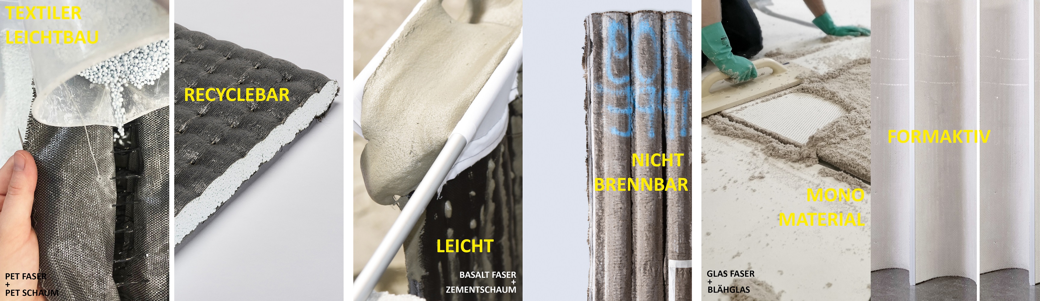 „Die im Projekt ge3TEX entwickelten Verbundmaterialien sind nachhaltig, sortenrein und kreislauffähig“, erklärt Projektleiterin Prof. Claudia Lüling vom Frankfurter Forschungsinstitut für Architektur, Bauingenieurwesen und Geomatik. „Sie sollten sowohl sehr gute Recyclingoptionen aufgrund der jeweils homogenen Werkstoffklassen aufweisen, als auch Synergieeffekte zwischen dem Schaum und den Textilien im Hinblick auf Lastabtragung, Dämmung, Wetter- und Brandschutz nutzen.“ Im Fokus des Projektes stand die Entwicklung von Bauteilen für den Wand- und Dachbereich. Es wurden gewebte, gewirkte und geschäumte Werkstoffe kombiniert, inspiriert von faser- und porenartigen Naturstrukturen.