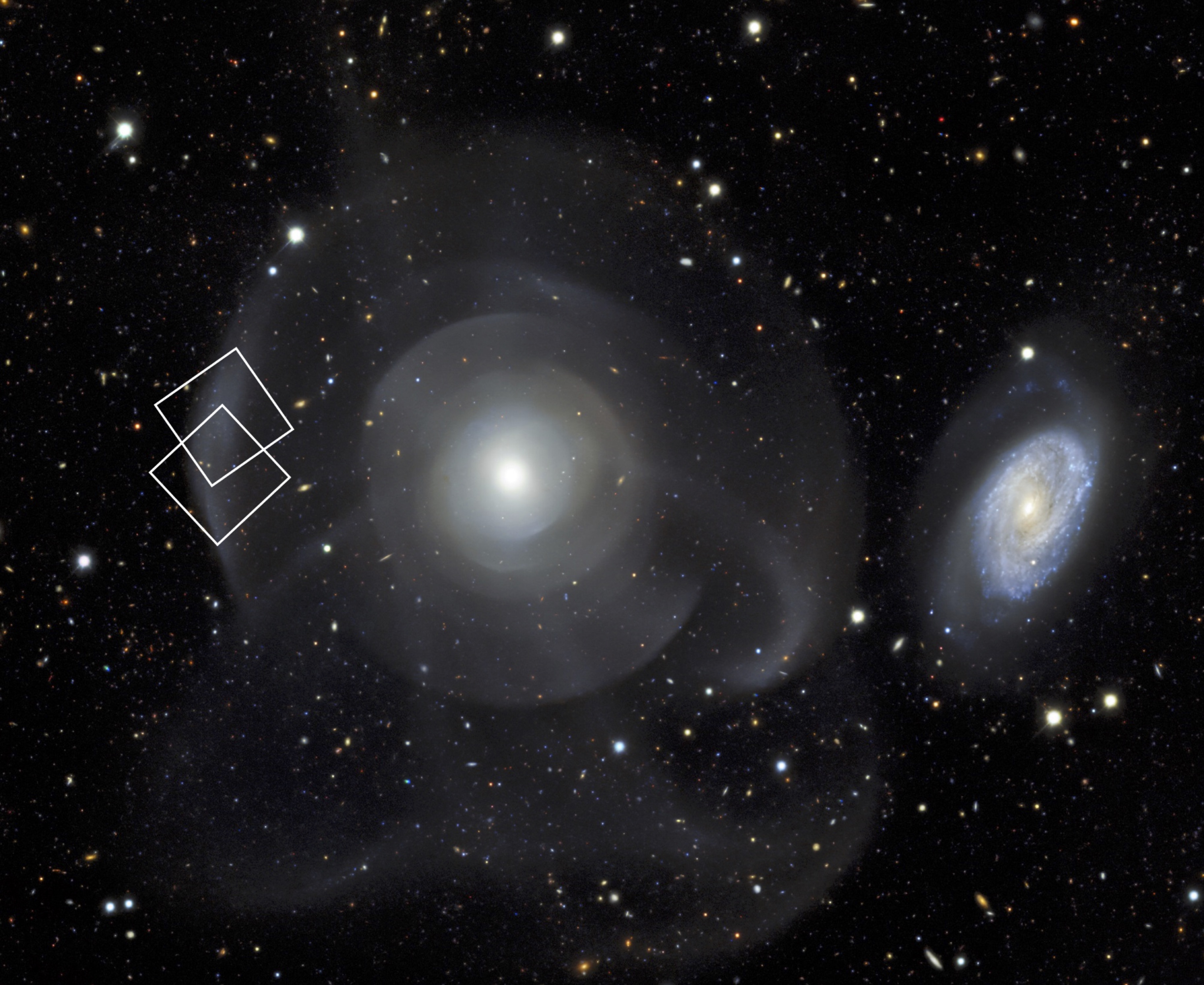 Die Galaxie NGC 474 ist ein besonders schönes Beispiel für eine Galaxie, die durch Kollision mit anderen, kleineren Galaxien eine auffällige Ringstruktur aus den durch Gravitationswirkung gestreuten Sternen gebildet hat. Sie liegt in etwa 110 Millionen Lichtjahren Entfernung, ist also ca. 170.000-mal weiter entfernt als der Helixnebel. Die scheinbare Helligkeit eines planetarischen Nebels in dieser Galaxie ist daher fast 30 Milliarden Mal geringer als die des Helixnebels und liegt im Bereich der kosmologisch interessanten Galaxien, für die das Team das MUSE-Instrument konzipierte.