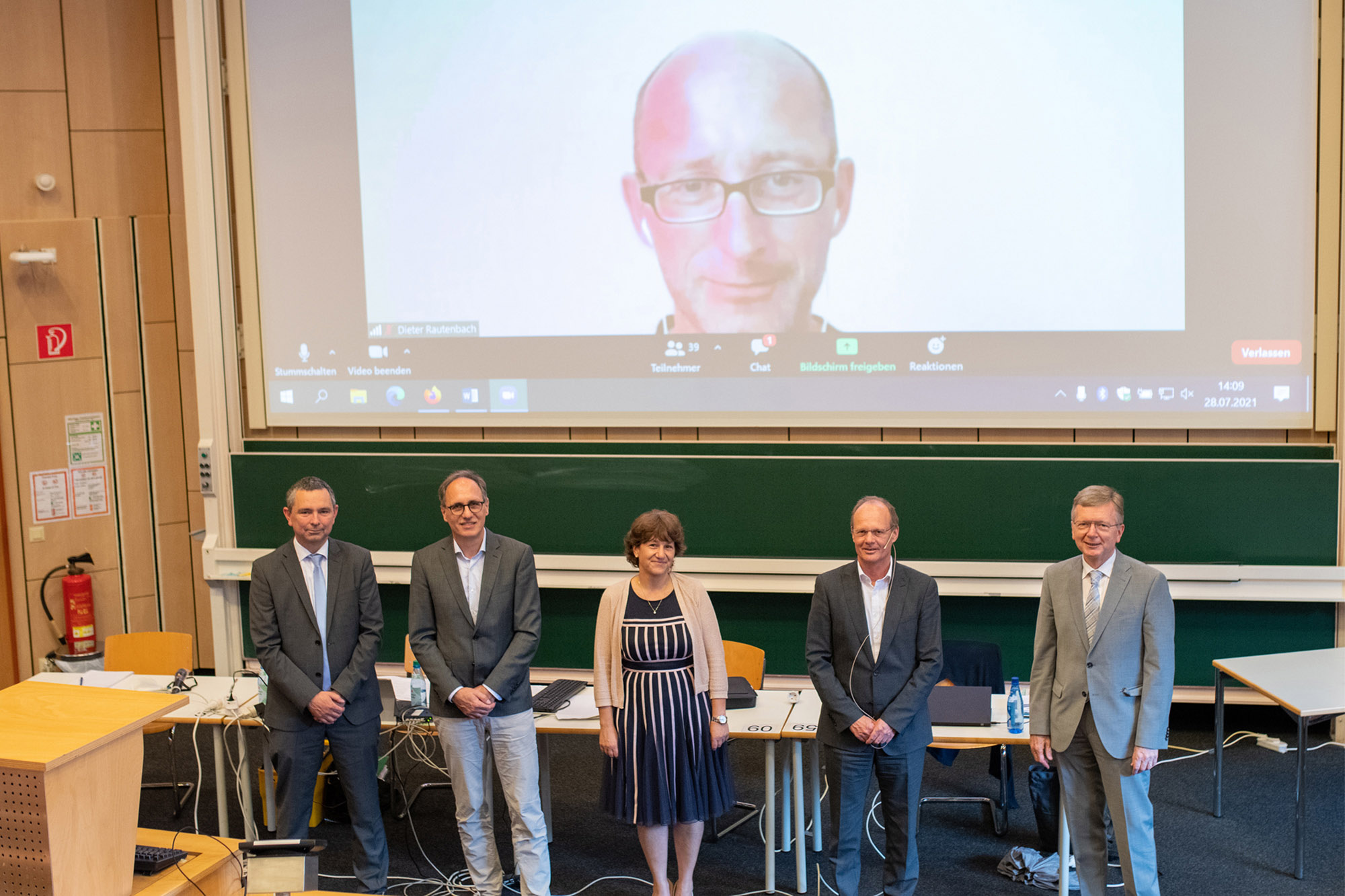 Vollständige Bildunterschrift: Das neue Präsidium der Universität Ulm (v.l.): Der neu gewählte Vizepräsident Prof. Michael Kühl sowie der bisherige Vizepräsident für Forschung Prof. Joachim Ankerhold neben Prof. Olga Pollatos (bislang Vizepräsidentin für Lehre) sowie Universitätspräsident Prof. Michael Weber und Kanzler Dieter Kaufmann. Auf der Leinwand zugeschaltet war Prof. Dieter Rautenbach, bisher Vizepräsident für Karriere. Die künftige Zuordnung der Geschäftsbereiche wird nach Amtsantritt bestimmt