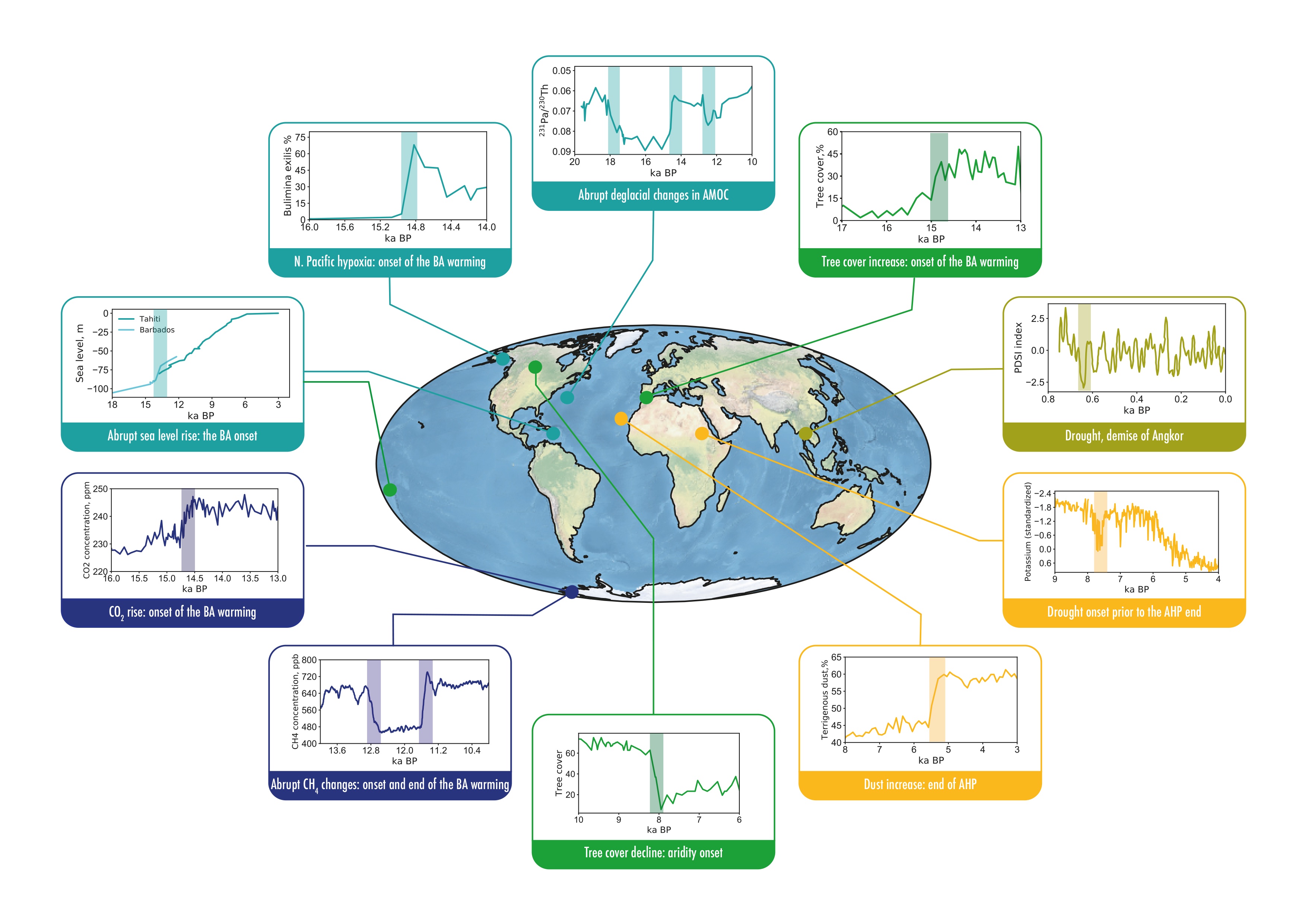 Abrupte Veränderungen im Erdsystem sind nicht auf einen bestimmten Bereich beschränkt, sondern können kaskadenartig durch Raum und Zeit wirken. Dr. Jonathan Donges, ein Co-Autor vom Potsdam-Institut für Klimafolgenforschung (PIK), kommentiert: "Eis-Ozean-Wechselwirkungen, zum Beispiel während des Beginns der Bølling-Allerød-Erwärmung in der Mitte des Übergangs von der letzten Eiszeit zur aktuellen holozänen Warmzeit, führten zu kaskadenartigen Änderungen wie zum Beispiel zum Sauerstoffmangel in der Tiefsee, zu Änderungen in der Vegetationsbedeckung auf dem Land und schließlich in der CO2- und CH4-Konzentration in der Atmosphäre. Diese Veränderungen könnten auch miteinander interagieren und sich gegenseitig verstärken und sich auf verschiedenen räumlichen Skalen ausbreiten, so dass sie vermutlich auch die menschlichen Jäger-Sammler-Gesellschaften zu dieser Zeit zu beeinflusst haben“.
