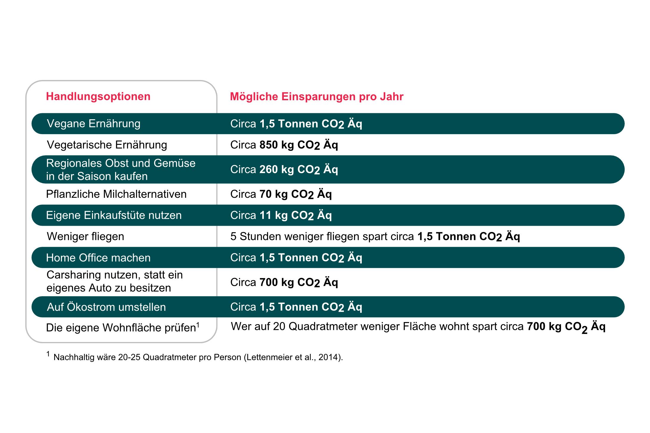 Neben Gastronominnen und Gastronomen sind weitere Akteurinnen und Akteure gefragt, die zu einer gelingenden Transformation des Ernährungssystems beitragen. Der Zukunftsimpuls gibt daher ebenfalls Empfehlungen an die Politik, (Land-)Wirtschaft und Wissenschaft sowie Tipps zu nachhaltigen Lebensstilen und was jede und jeder Einzelne dafür tun kann. Die Autorinnen ordnen dafür unter anderem die Wirkung von Klimatipps ein, wie etwa Fleisch versus vegane Ernährung. Denn häufig ist nicht klar, was wirklich viel CO2-Ersparnis bringt: eine eigene Einkaufstüte nutzen, regionales Obst und Gemüse kaufen oder sich vegan ernähren? Die Tabelle zeigt beispielsweise, dass eine vegane Ernährung rund 1,5 Tonnen CO2-Äquivalent einspart und schon die Umstellung auf pflanzliche Milchalternativen rund 70 Kilogramm CO2-Äquivalente ausmachen.