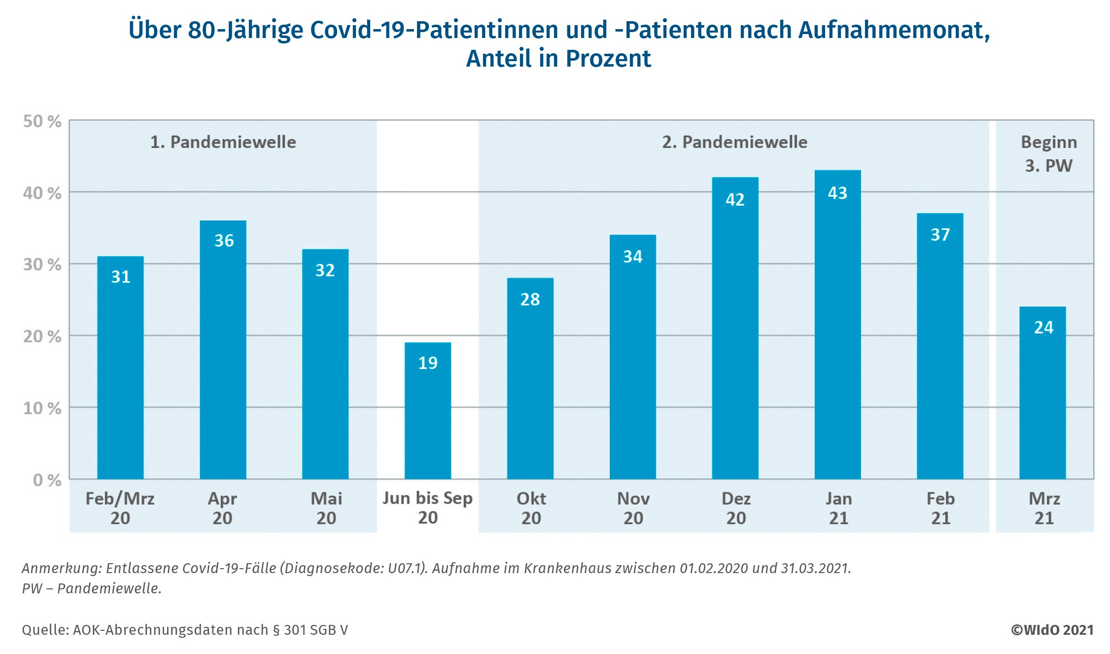 Das Durchschnittsalter der Patientinnen und Patienten war in der zweiten Welle mit 69,6 Jahren etwas höher als in der ersten (68,0 Jahre) und sank mit Beginn der dritten Welle im März 2021 auf 63,6 Jahre. „Das hat damit zu tun, dass in der dritten Welle verstärkt Menschen mittleren Alters intensivmedizinisch behandelt werden mussten, die zu diesem Zeitpunkt noch keine Impfung erhalten hatten“, erläutert Jürgen Klauber. Die Verschiebung der Altersstruktur wird auch deutlich, wenn man sich den Anteil der über 80-jährigen Covid-19-Patienten in den Kliniken anschaut: Im Dezember 2020 und Januar 2021 waren noch über 40 Prozent der stationär behandelten Patientinnen und Patienten über 80 Jahre alt, im Februar 2021 dann noch 37 Prozent und im März 2021 nur noch 24 Prozent (Abbildung 4).