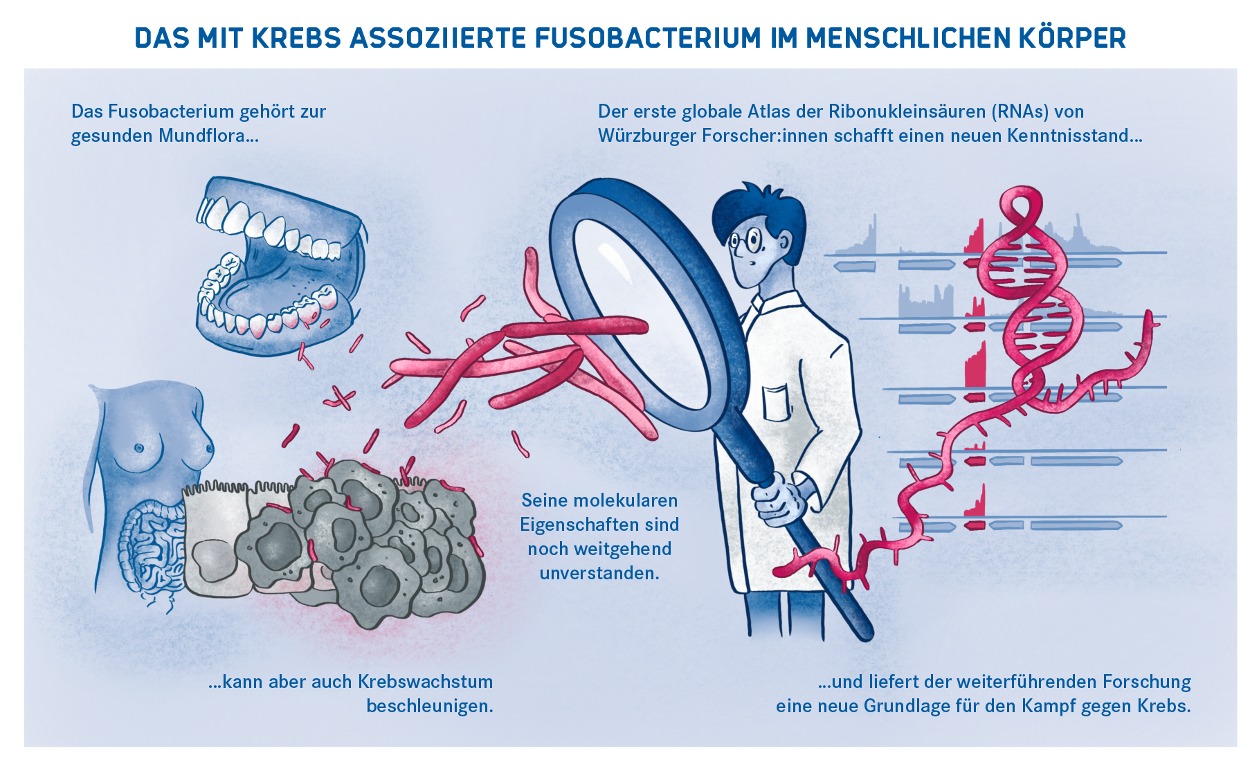 Der Mundhöhlenkeim Fusobacterium nucleatum ist dafür bekannt, das Wachstum menschlicher Karzinome, etwa im Darm oder in der Brust, zu beschleunigen. Das Helmholtz-Institut für RNA-basierte Infektionsforschung (HIRI), ein Standort des Helmholtz-Zentrums für Infektionsforschung (HZI), und die Julius-Maximilians-Universität (JMU) in Würzburg haben jetzt in einer gemeinsamen Studie die RNA-Moleküle von fünf klinisch relevanten Stämmen dieses anpassungsfähigen Erregers kartiert. Die gewonnenen Erkenntnisse könnten dazu beitragen, neue Therapien bei verschiedenen Krebserkrankungen zu entwickeln. Die Forschungsergebnisse wurden in der Fachzeitschrift Nature Microbiology veröffentlicht.