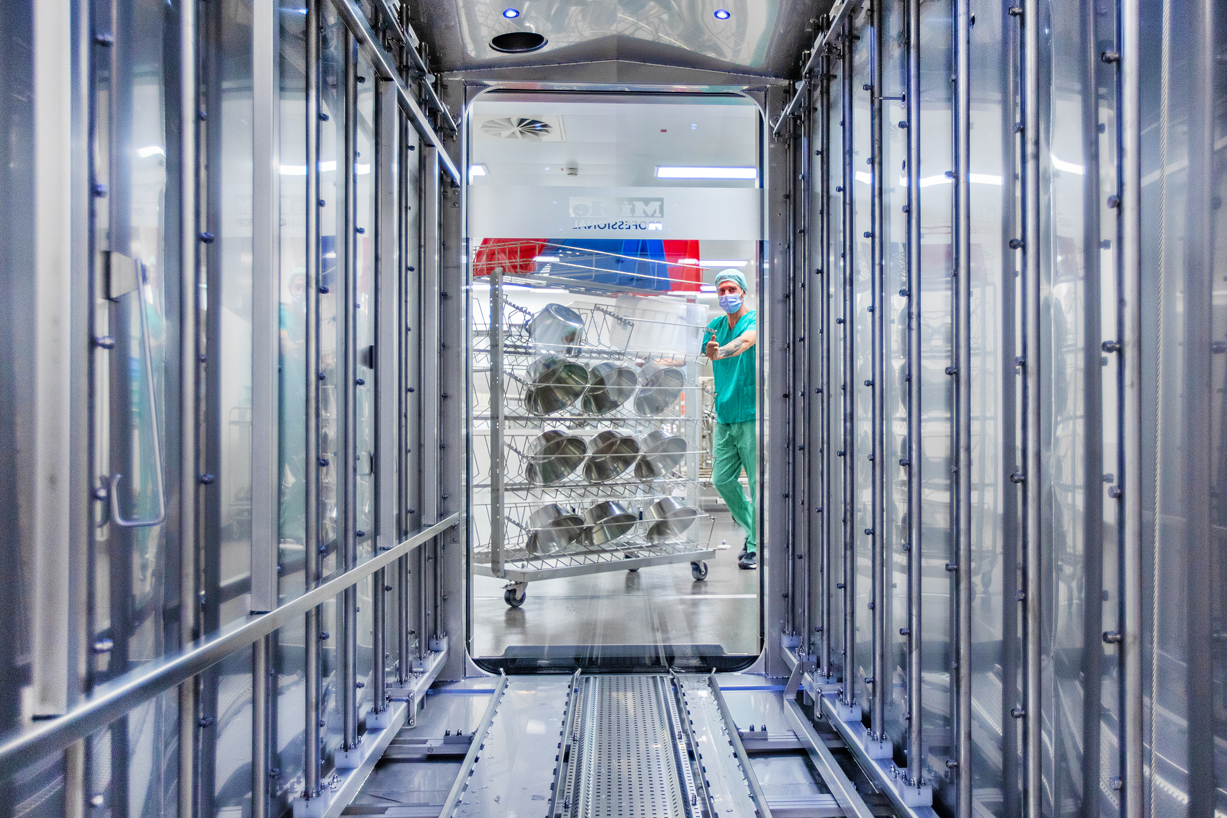 „Die Instrumente werden immer kleiner und spezialisierter, die gesetzlichen Anforderungen an die Aufbereitung dieser Instrumente steigen stetig - daher wird auch der Aufbereitungsprozess zunehmend komplexer“, erklärt Sören Brauer, Leiter der Abteilung Aufbereitung im Geschäftsbereich Logistik. Entsprechend hoch technisiert sind die Reinigungsverfahren. Zur Reinigung der Instrumente aus der robotergestützten Chirurgie wird zum Beispiel Ultraschall eingesetzt. Alle Prozesse in der AEMP werden kontrolliert und elektronisch dokumentiert. Jedes Sieb bekommt einen Barcode und wird individuell mit den Instrumenten bestückt, die von den einzelnen OP-Sälen angefordert wurden. Die AEMP ist eine der größten und modernsten in Deutschland.