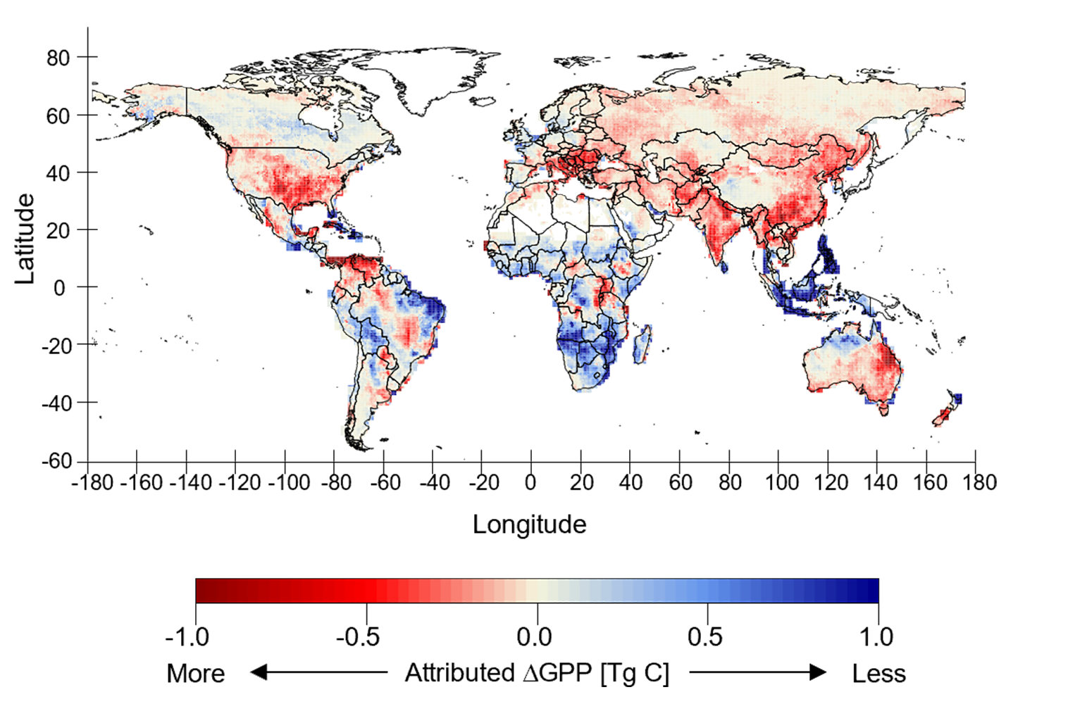 Changes in the impact of drought events on the carbon cycle between the 2000 – 2016 and 1982 – 1998 periods. The presented map shows the difference in negative extremes of CO2 fixation through plants via photosynthesis (Delta GPP) attributed to drought events between the two periods. A reduced CO2 uptake is shown in red. Source: Nature Climate Change/University of Augsburg