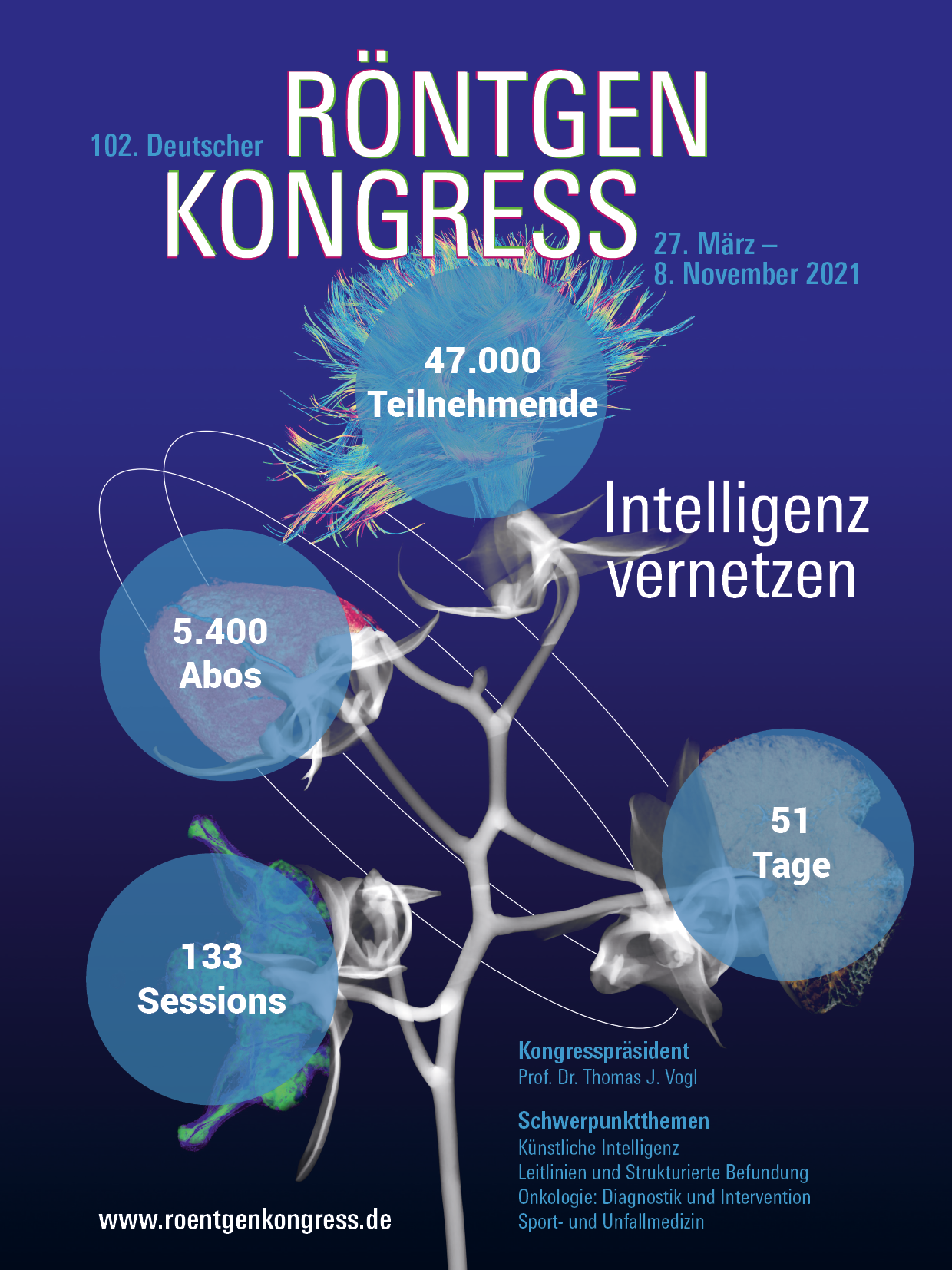 Ob Aktuelles zu COVID-19, Highlights zur Sport- und Unfallmedizin oder wegweisende Vorträge aus dem Bereich der Künstlichen Intelligenz: Die 5.400 Abonnentinnen und Abonnenten des 102. Deutschen Röntgenkongresses konnten an den bereits 51 gelaufenen Kongresstagen aus 133 breitgefächerten Sessions das für sie passende Programm auswählen. „Es ist eine großartige Bestätigung, dass wir mit dem interessanten Themenmix aus Fortbildungs-, Wissenschafts- und Industrieprogramm ein breites Publikum erreichen können und die Nachfrage nach digitalen, radiologischen Fortbildungsmöglichkeiten weiterhin hoch ist“, sagt Kongresspräsident Prof. Dr. Thomas J. Vogl vom Universitätsklinikum Frankfurt am Main.