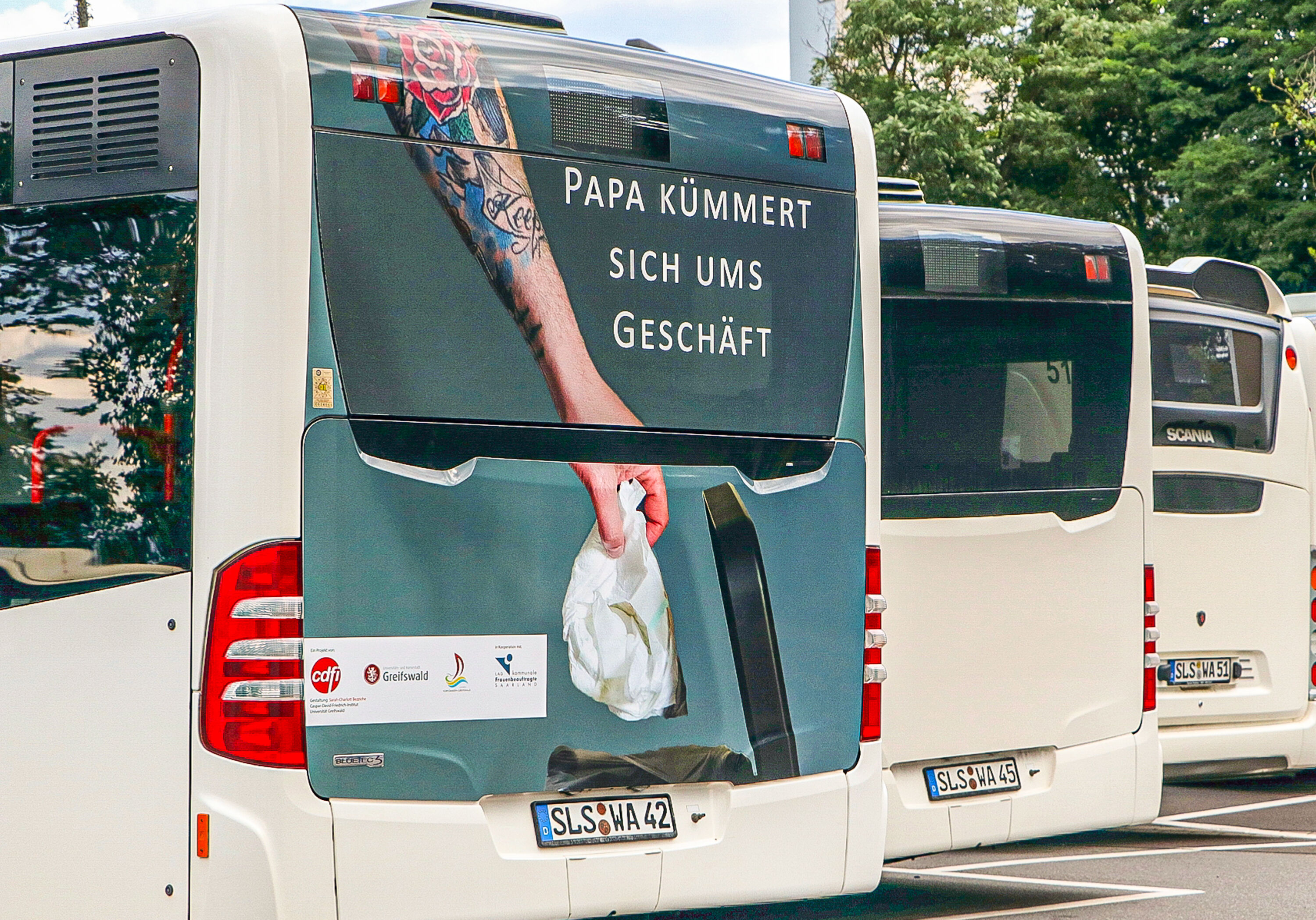 Ziel dieser Aktion ist es, das Thema Vereinbarkeit von Beruf und Familie, Elternzeit und speziell Väter in Elternzeit in den Fokus der Öffentlichkeit zu bringen. Im Landkreis Saarlouis beispielsweise ist eines dieser Plakate auf einer Busrückseite mit dem Motiv „Papa kümmert sich ums Geschäft“ bedruckt. Zu sehen ist ein tätowierter Männerarm, der eine Windel in den Mülleimer wirft. Dieses Motiv wirbt nun ein Jahr lang im ganzen Landkreis mobil für einen Wandel zu mehr Partnerschaftlichkeit. Auch in Bussen sind die Motive aus Greifswald zu sehen, auf über 80 öffentlichen Plakatflächen in Saarlouis und Dillingen, in Schulen und Kindertagesstätten sowie im gesamten Stadtgebiet Saarbrücken.