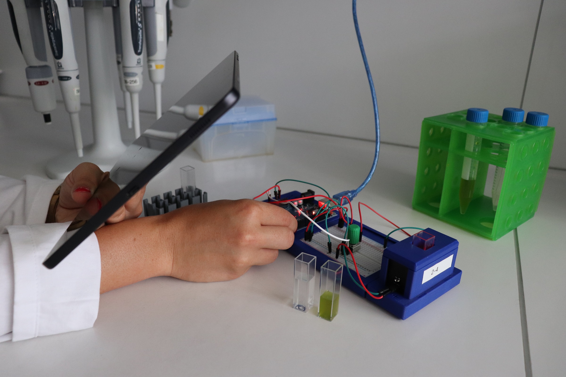 Geuer führt aus: „Aktuell konstruieren und testen wir AR-Umgebungen zum Thema 'Biotechnologie'. So können Schüler*innen anhand von Experimentierkoffern die Kultivierung von Mikroorganismen in Bioreaktoren kennenlernen. Regelmäßige analytische Messungen ermöglichen es, wissenschaftliche Aussagen zum mikrobiellen Wachstum zu treffen. Die Schüler*innen wenden dabei ihr Wissen zu analytischen Methoden an, stellen Vergleiche zwischen den Methoden her und arbeiten in der Auswertung mit den eigens erfassten Daten.“