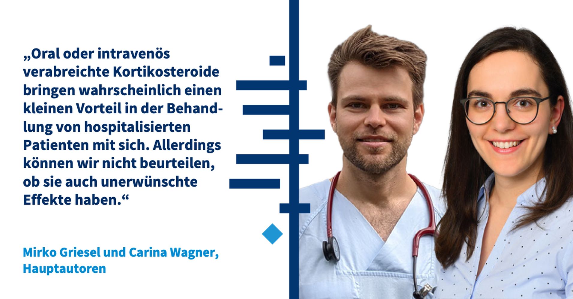 „Oral oder intravenös verabreichte Kortikosteroide bringen wahrscheinlich einen kleinen Vorteil in der Behandlung von hospitalisierten Patienten mit sich. Allerdings können wir auf Basis der vorliegenden Evidenz nicht beurteilen, ob sie in der Behandlung von COVID-19 auch unerwünschte Effekte haben“, kommentieren die beiden Hauptautor*innen Mirko Griesel und Carina Wagner.