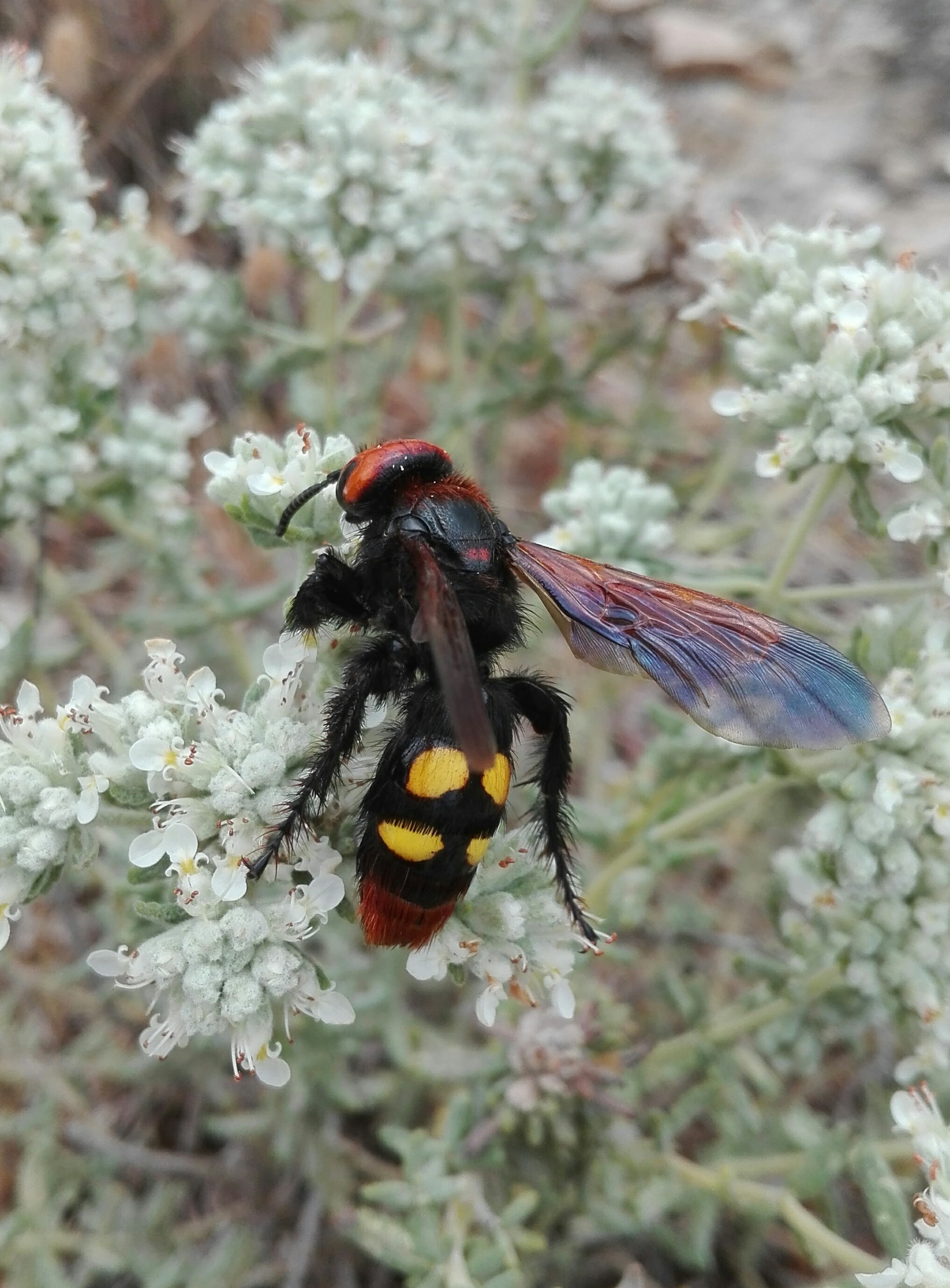 Die ausgewachsenen Tiere sind Nektarfresser und bevorzugen blaue und rotblaue Blüten verschiedener Pflanzenfamilien. Am aktuellen Fundort in Hohenau an der March besuchten sie vorwiegend die in Österreich nicht heimische Gewöhnliche Seidenpflanze (Asclepias syriaca). Ihren Nachwuchs versorgen die Wespen mit Larven des ebenfalls in der Gegend vorkommenden Nashornkäfers (Oryctes nasicornis).