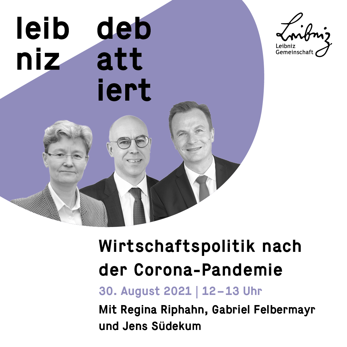 Am 30. August lädt die Leibniz-Gemeinschaft zu einer virtuellen Veranstaltung in der Reihe „Leibniz debattiert“ ein. Eine Podiumsdiskussion mit Gabriel Felbermayr, Regina Riphahn und Jens Südekum über staatliche Hilfsprogramme, Klimaneutraliät und Welthandel.