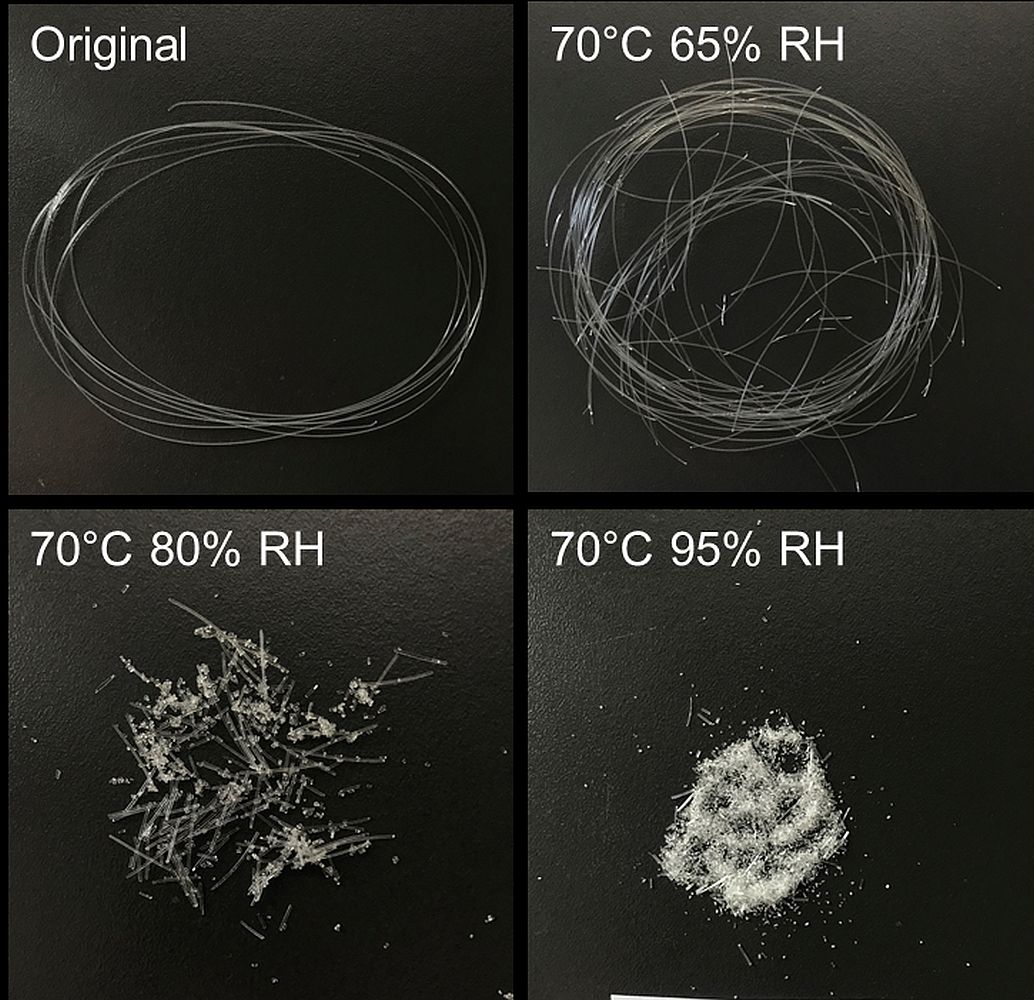 Wie im Bild zu sehen ist, wurden die Monofilamente bei höheren Temperaturen ab 70 Grad Celsius bereits nach zwei Wochen brüchig, worüber die DTNW-Autorinnen und -Autoren kürzlich im Journal Applied Polymer Materials berichteten. Unter Normbedingungen indes weisen die Monofilamente auch nach fast drei Jahren keine messbar verringerte Stabilität auf und auch die PLA-Vliesstoffe standen ihren auf fossiler Basis hergestellten Pendants in Punkto Filterleistung in nichts nach. „Der Fokus für die Nutzung von PLA als Filtermaterial wird meiner Ansicht nach auf Anwendungen liegen, bei denen relativ geringe Temperaturen vorliegen, mit denen PLA sehr gut zurechtkommt“, sagt DTNW-Wissenschaftlerin Christina Schippers.
