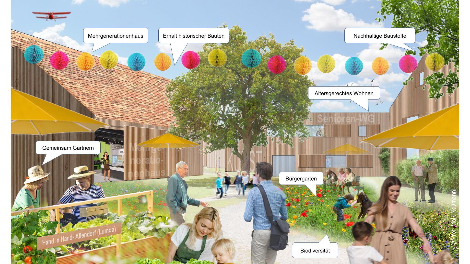 Das von einer genossenschaftlichen Initiative getragene Vorhaben „Hand in Hand - Neue Altstadt“ in Allendorf und nun durch den Hessischen Innovationspreis ausgezeichnete Konzept des TransMIT-Zentrums für integrales Bauen zielt dementsprechend auf eine altersgerechte Umgestaltung historischer Bausubstanz und des öffentlichen Raums im Ortskern. Das Quartier „Altstadthöfe“ soll unter dauerhafter Einbeziehung und Mitwirkung der Anwohner des Quartiers künftig vielfältige Lebens- und Wohnmodelle bieten und so als Mehrgenerationen-Wohnprojekt auch die Innenlage von Allendorf revitalisieren. Neben der multifunktionalen Gestaltung von Wohnungen, Gebäuden und des gesamten Quartiers sowie der Schaffung von gemeinschaftlichen Begegnungsräumen im Außen- sowie im Innenbereich von zu einem Mehrgenerationenhaus umgenutzten Scheunen , die den Zusammenhalt fördern, wird es nicht zuletzt gerade älteren Menschen besser ermöglicht, als Alternative zur Unterbringung im Seniorenheim im gewohnten häuslichen Umfeld zu bleiben.