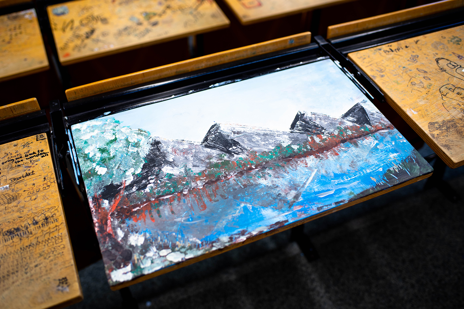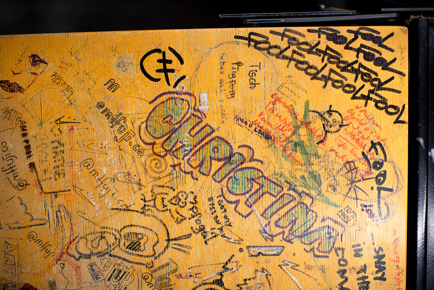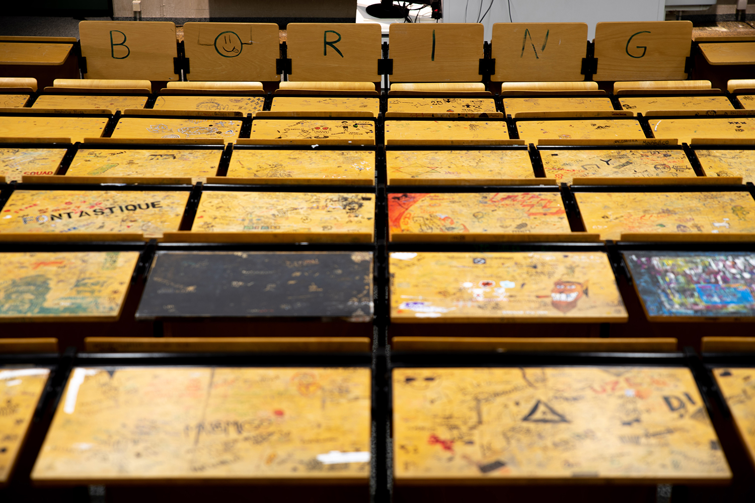 In mehreren Jahrzehnten haben Studierende der Medienproduktion an der TH OWL ein kleines Kunstwerk geschaffen. In Vorlesungen und Seminaren haben sie die Tische in ihrem Hörsaal mit bunten Zeichnungen, Sprüchen und Liebeserklärungen bemalt. Jetzt wurde der Hörsaal saniert, aber die Tische bleiben erhalten. „Diese Tische sind in gewisser Weise ein Dokument der Zeitgeschichte, deshalb werden wir sie auf jeden Fall aufbewahren, auch wenn unsere Studierenden jetzt in neue Hörsäle und Seminarräume nach Detmold ziehen, die übrigens gerne noch eine längere Zeit neu aussehen dürfen“, sagt Professor Guido Falkemeier, Dekan der Medienproduktion. Auch am Standort Lemgo wurden die Hörsäle aufwendig saniert und die Tische ausgetauscht. Einen Teil der Tische will der Fachbereich an Absolventinnen und Absolventen des Bachelor- und Master-Studiengangs Medienproduktion verlosen.