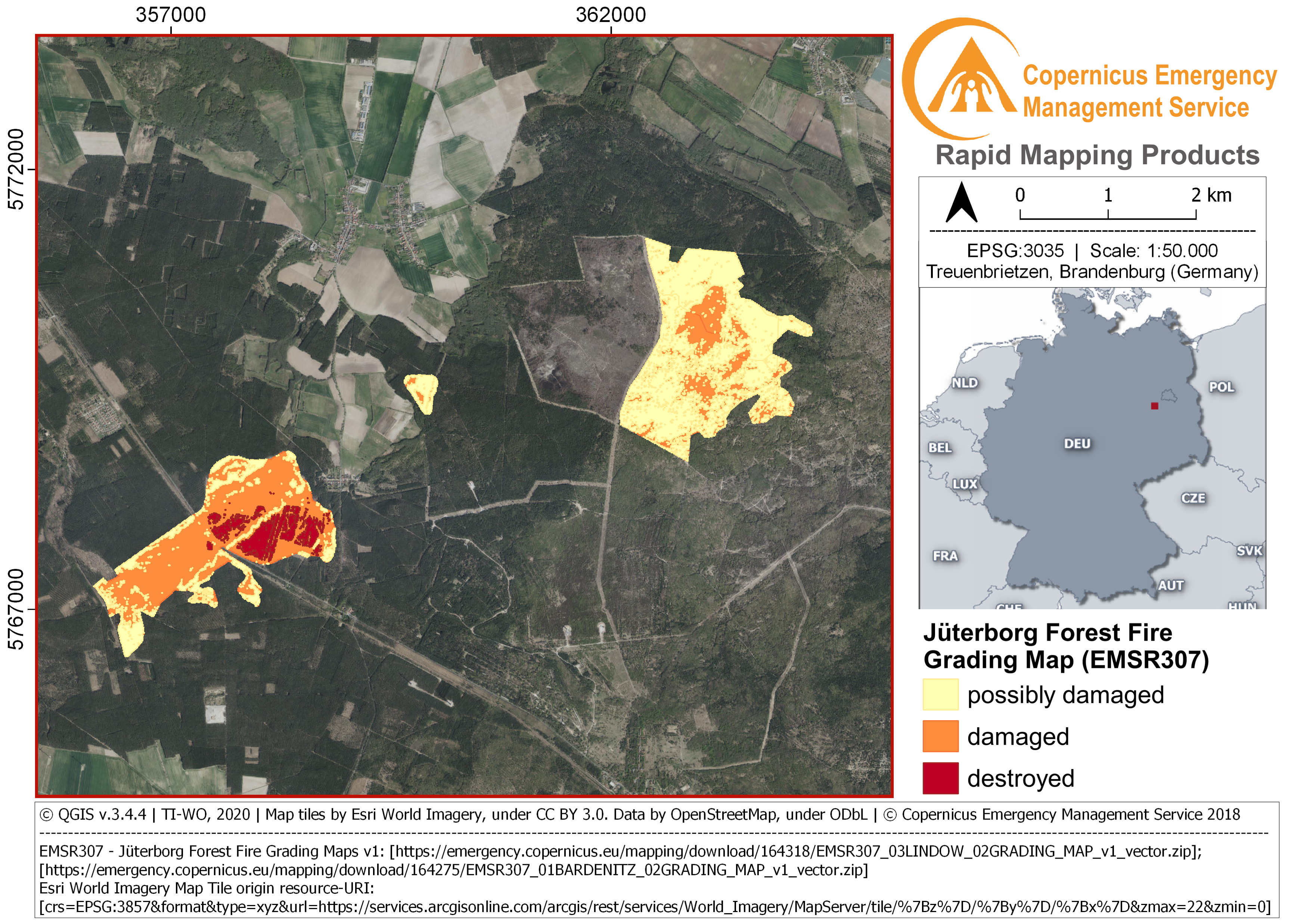 Um die vielfältigen Ökosystemdienstleistungen der Wälder erhalten zu können, werden kontinuierliche und flächendeckende Monitoring-Systeme gebraucht. Die etablierten Systeme stellen hierzu umfangreiche Feldbeobachtungen und langjährige Expertise zum Ökosystem Wald bereit, können aber grundsätzlich keine räumlich expliziten Daten liefern. Zudem sind sie periodisch angelegt mit langen Zeiträumen zwischen den Stichtagen. Neue technische Entwicklungen in der Fernerkundung eröffnen dagegen vielfältige Anwendungsmöglichkeiten in bisher unbekanntem Detailgrad. Im Falle eines Waldbrandes zum Beispiel ermöglichen sie eine schnelle Kartierung der Lageeinschätzung, Ausbreitung und Intensität des Feuers (Abbildung).