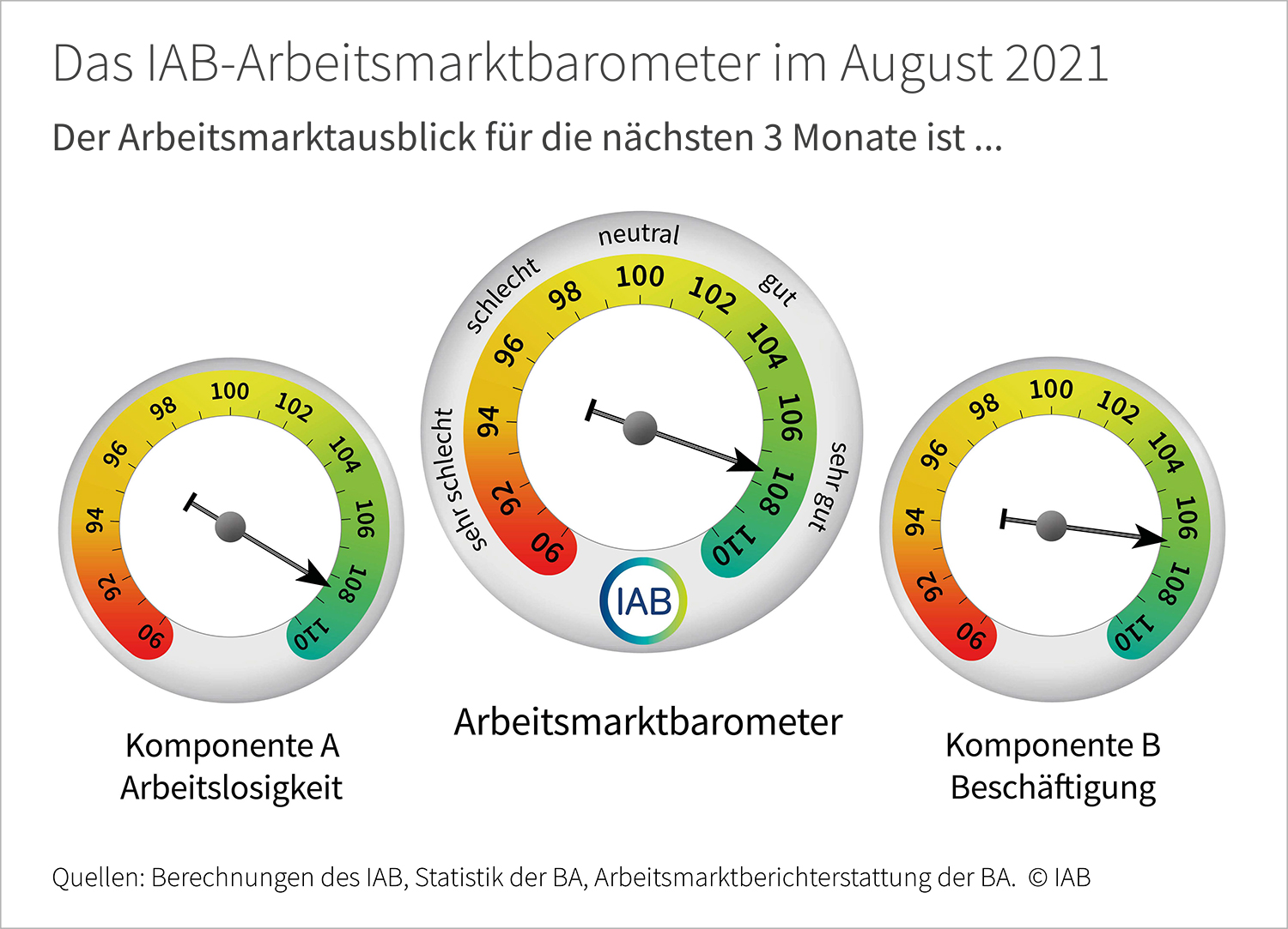Das IAB-Arbeitsmarktbarometer ist ein seit November 2008 bestehender Frühindikator, der auf einer monatlichen Umfrage der Bundesagentur für Arbeit unter allen lokalen Arbeitsagenturen basiert. Während Komponente A des Barometers die Entwicklung der saisonbereinigten Arbeitslosenzahlen für die nächsten drei Monate prognostiziert, dient Komponente B der Vorhersage der Beschäftigungsentwicklung. Der Mittelwert aus den Komponenten „Arbeitslosigkeit“ und „Beschäftigung“ bildet den Gesamtwert des IAB-Arbeitsmarktbarometers. Dieser Indikator gibt damit einen Ausblick auf die Gesamtentwicklung des Arbeitsmarkts. Da das Saisonbereinigungsverfahren laufend aus den Entwicklungen der Vergangenheit lernt, kann es zu nachträglichen Revisionen kommen. Die Skala des IAB-Arbeitsmarktbarometers reicht von 90 (sehr schlechte Entwicklung) bis 110 (sehr gute Entwicklung).