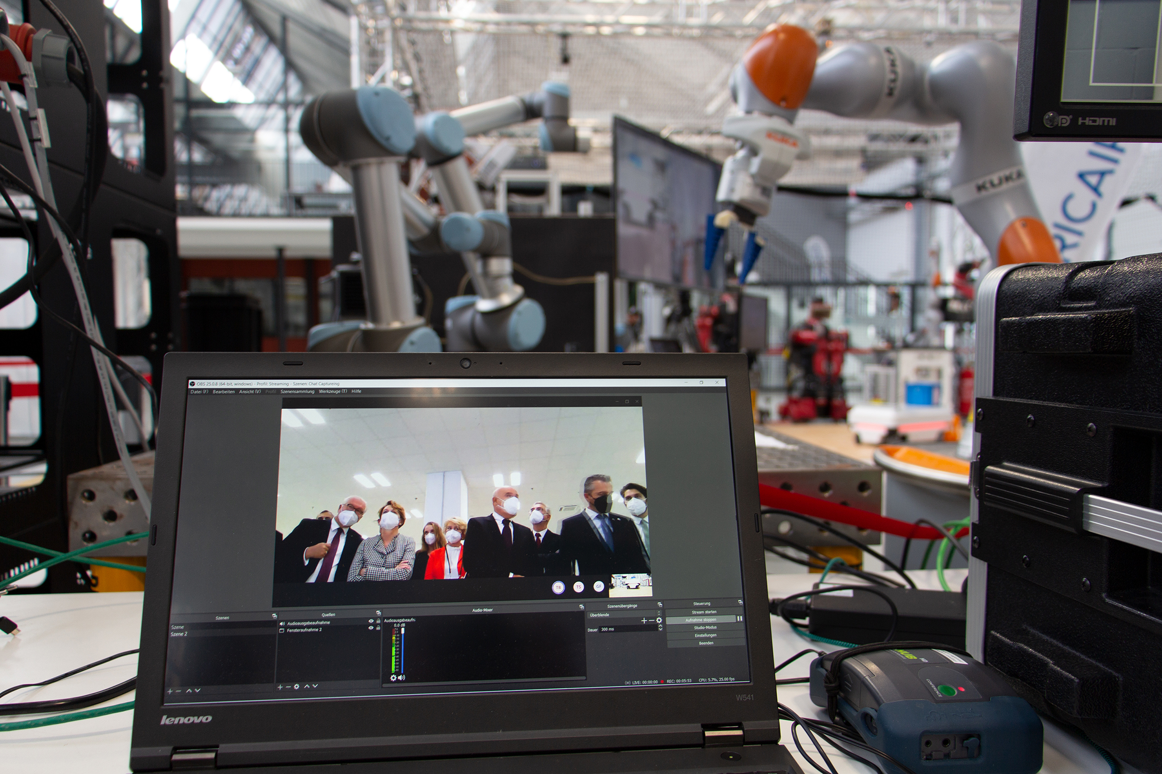 Im Rahmen seines Staatsbesuchs in Tschechien besuchten Bundespräsident Frank-Walter Steinmeier und seine Frau am 27.8.2021 das RICAIP-Zentrum an der Tschechischen Technischen Universität (CTU) in Prag. Das Zentrum ist ein Ergebnis der tschechisch-deutschen Industrie 4.0-Zusammenarbeit. Am Tschechischen Institut für Informatik, Robotik und Kybernetik CIIRC CTU erlebte der deutsche Bundespräsident innovative Forschungsprojekte aus den Bereichen Robotik, Künstliche Intelligenz und Industrie 4.0. Ein Highlight war die Live-Übertragung eines Praxisbeispiels für Mensch-Roboter-Kooperation in der verteilten Produktion aus dem RICAIP-Testbed in Saarbrücken.