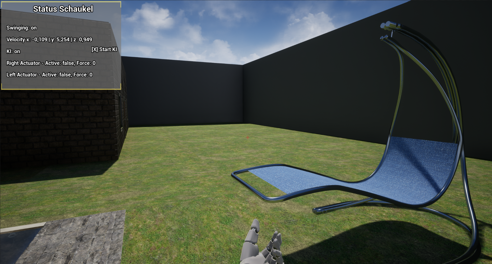 Bereits im Wintersemester 2020/21 haben Studierende des Master-Studiengangs Allgemeine Informatik mit der Entwicklung eines Antriebs für eine Schaukelliege begonnen. Durch Magnetspulen werden Gewichte verlagert, um die Schaukelliege mittels eines Regelkreises, gesteuert durch einen Beschleunigungssensor, zu bewegen. In Zusammenarbeit mit dem gleichen echten Kunden entwickelten die Studierenden nun dafür ein Simulationsmodell mit einer sogenannten Game Engine als Entwicklungsumgebung. „Die Studierenden sollten im Team die Simulation einer ruckelfreien Schaukelbewegung erstellen und visualisieren. Dabei konnten sie die gleichen Sensor- und Bewegungsdaten mit den Daten der echten Schaukel abgleichen, um so die Sensoren und Aktoren realistisch darzustellen“, erklärt Auftraggeber und Alumnus M. Vöhringer. Berücksichtigt wurden bei der Visualisierung auch äußere Einflüsse, welche die regelmäßige Bewegung der Schaukel stören könnten. „Genau hier war es Aufgabe der Studierenden, die Methoden der Künstlichen Intelligenz, kurz KI, an geeigneter Stelle einzusetzen und die Möglichkeiten der Game Engine kennenzulernen“, ergänzt Liebehenschel. Beide Gruppen verfolgten hierbei Ansätze mit unterschiedlichen Game Engines (Unity und Unreal Engine). Eine Gruppe nutzte einen herkömmlichen Ansatz zur Bewegung der Schaukel, die andere maschinelles Lernen, eine Methode aus dem Bereich der KI.