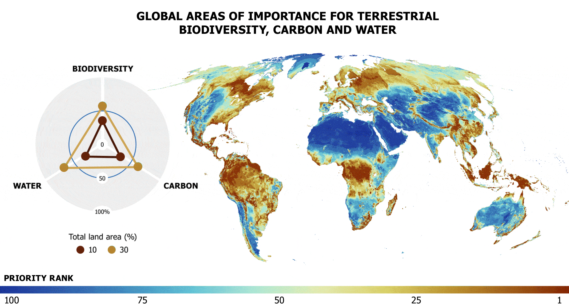 Jung, M., Arnell, A., de Lamo, X., García-Rangel, S., Lewis, M., Mark, J., Merow, C., Miles, L., et al. (2021). Areas of global importance for conserving terrestrial biodiversity, carbon, and water. Nature Ecology and Evolution DOI: 10.1038/s41559-021-01528-7