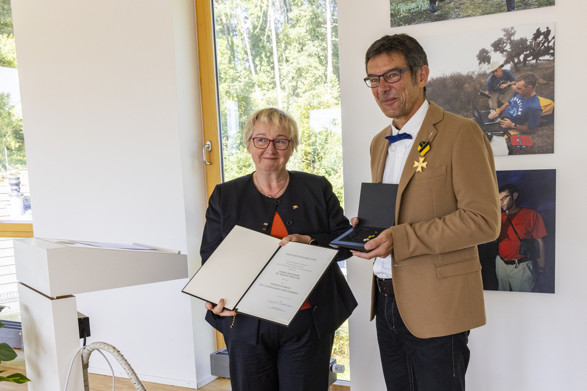 Bildunterschrift: Prof. Dr. Martin Wikelski erhielt den Verdienstorden des Landes Baden-Württemberg aus den Händen von Wissenschaftsministerin Theresia Bauer.