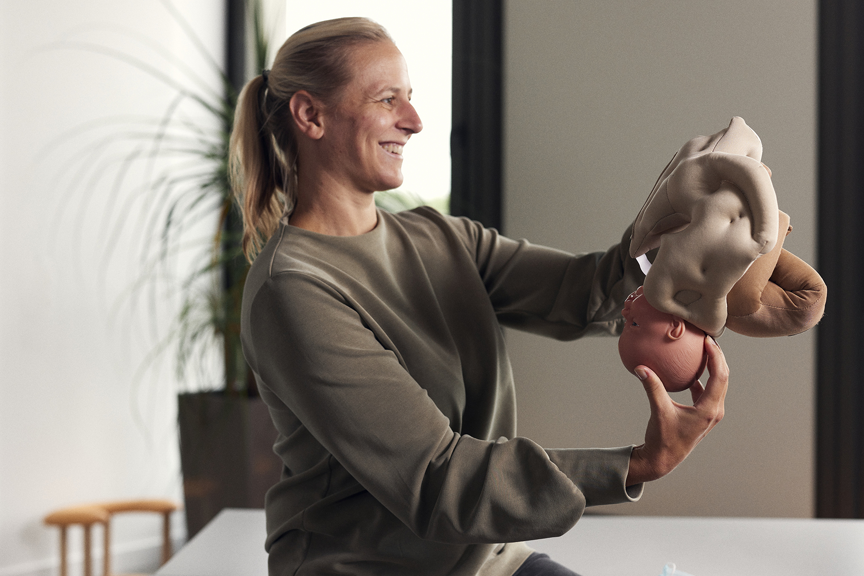 Nun packt die Hebamme eine kleine, weiche Babypuppe aus. Sie steckt in einem Beutel aus durchsichtigem Stoff und ist mit diesem durch eine dicke Kordel verbunden. „Das ist die Fruchtblase samt Plazenta und Nabelschnur“, erläutert Pia Bakker und demonstriert, wie das Baby aus der Fruchtblase heraus und durch das Becken hindurch seinen Weg nach draußen findet. Das Modell kommt unter anderem in Geburtsvorbereitungskursen zum Einsatz, ein weiteres Arbeitsfeld der Hebammen. Die Studierenden üben damit, wie sie werdenden Eltern den Geburtsweg vermitteln.