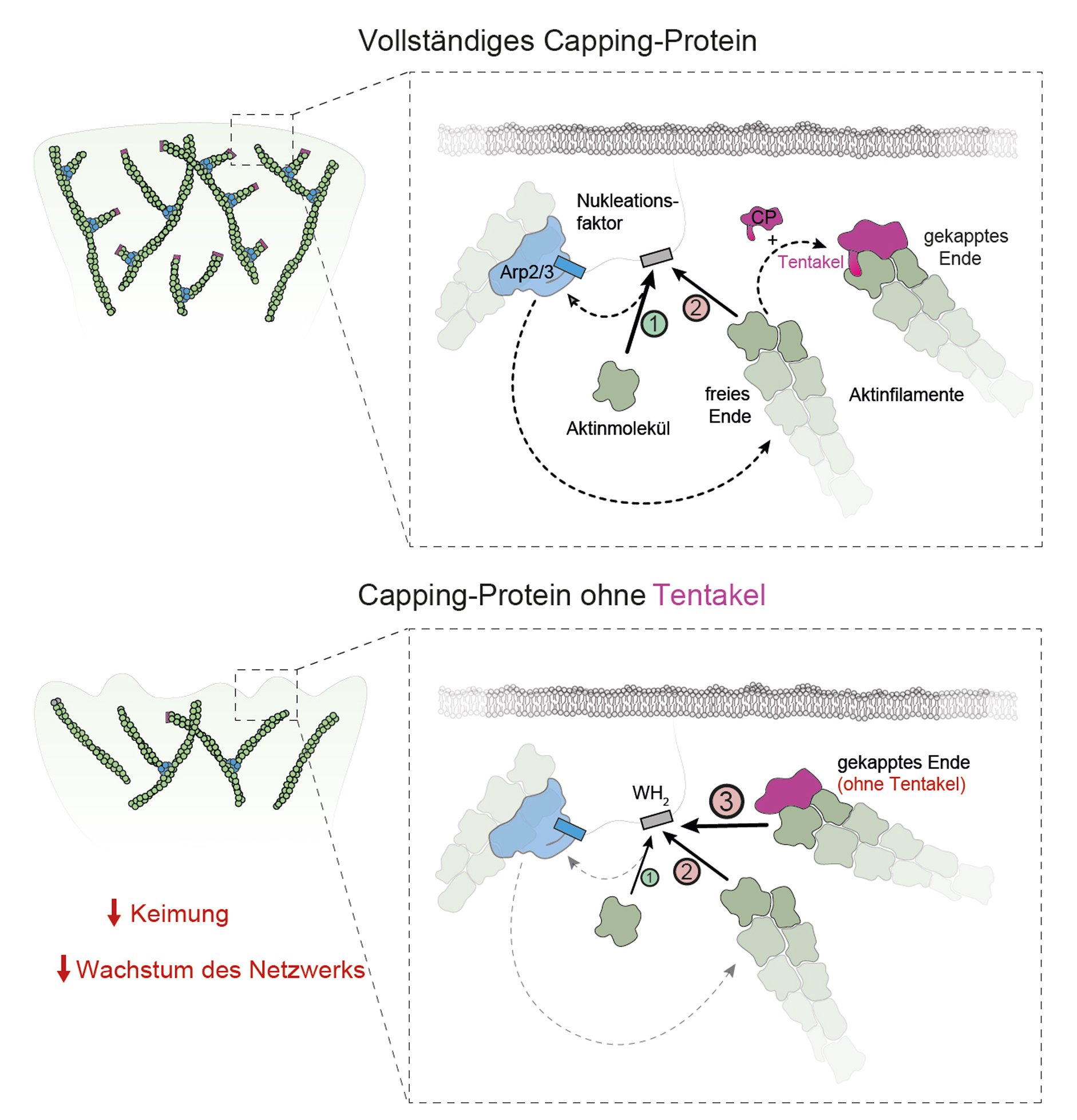 Dem interdisziplinären Team aus Strukturbiologen und Biochemikern vom MPI in Dortmund, zusammen mit Zellbiologen der Universität Braunschweig, ist es nun gelungen, den bisher rätselhaften Mechanismus hinter der gegenläufigen Funktion des Capping-Proteins aufzuklären. Ein von Felipe Merino, Erstautor der Studie, mittels Kryo-Elektronenmikroskopie erzeugtes hochauflösendes 3D-Bild der Struktur eines Aktinfilaments gebunden an ein Capping-Protein zeigte, dass dieses viel mehr kann als bisher angenommen: Es stoppt nicht nur das Wachstum der Filamente, sondern blockiert über einen tentakelähnlichen Fortsatz die Bindung von keimbildungsfördernden Faktoren. Johanna Funk, ebenfalls Erstautorin der Studie, konnte weiterhin zeigen, dass das Entfernen dieses Tentakels zwar nicht das Kappen der Filamente beeinflusste, aber im Zusammenspiel mit anderen Proteinen des Aktinnetzwerks, dessen Aufbau drastisch hemmte. Dies führte auch zu einer Verringerung der Effizienz von Lamellipodien, die für die Zellbewegung notwendigen armartigen Ausstülpungen.