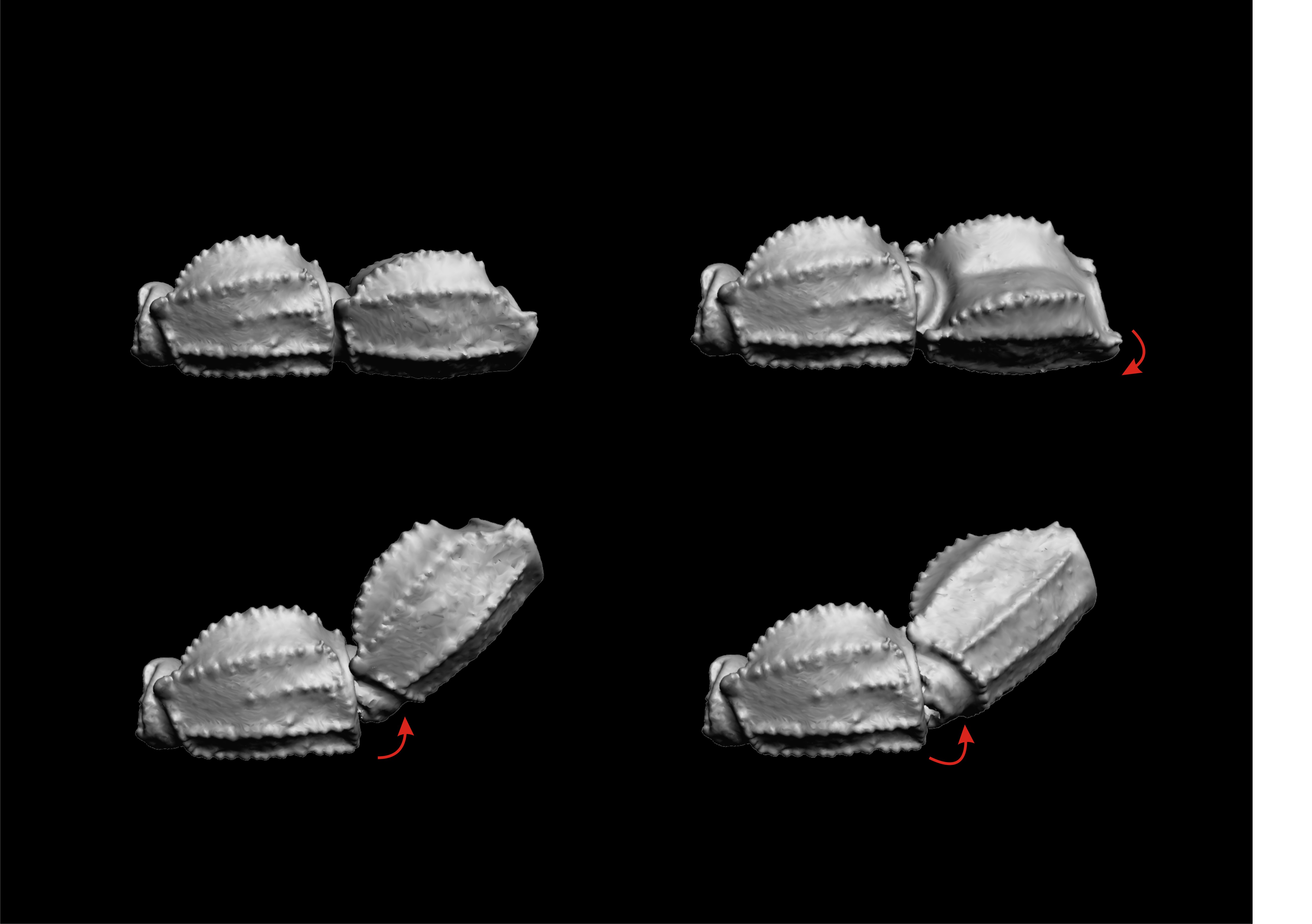 Doch wie muss ein Gelenk aussehen, um einen ganzen Körperabschnitt so beweglich werden zu lassen und wo liegt der Unterschied zu den Gelenken der Körperanhänge? Funktionell betrachtet ähnelt das Gelenk der Skorpionsschwänze einem Scharniergelenk mit zwei Kontaktflächen, wie man es auch in einem Arthropodenbein, also Gliederfüßern, finden würde. Anders als das Scharniergelenk hat das Gelenk der Skorpionsschwänze aber keine Gelenkpfanne und keinen Gelenkkopf, sondern zwei sattelartige Strukturen, die auf einer nahezu kreisrunden Öffnung gleiten. Das Prinzip, welches auf weiteren strukturellen Besonderheiten basiert, erlaubt es, die eindimensionale Bewegung eines Scharniergelenkes, um die Möglichkeit einer Drehung zu erweitern.