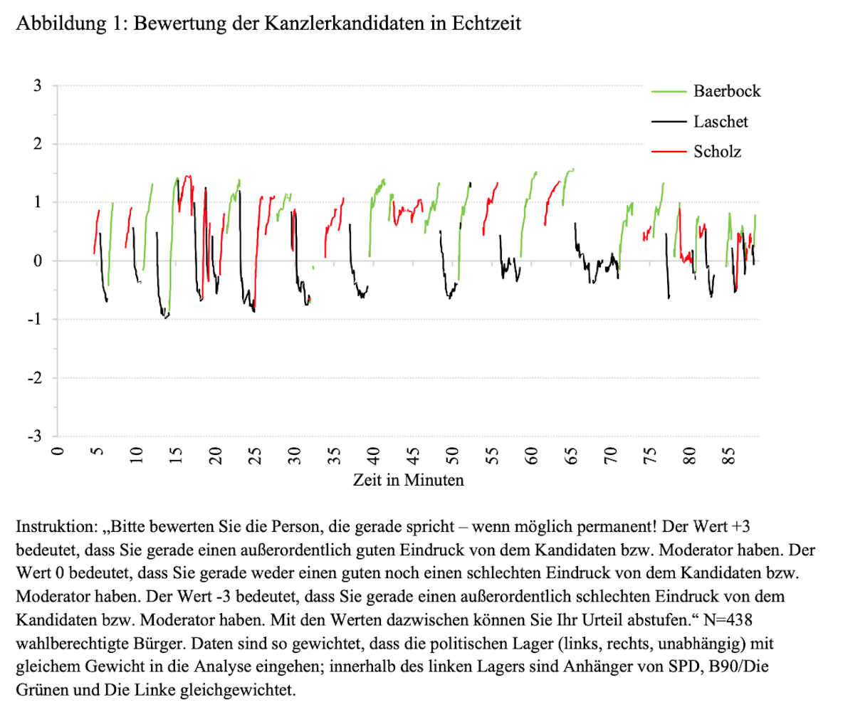 Wahrnehmung und Wirkung der dritten TV-Debatte 2021 zwischen den Kanzlerkandidaten Armin Laschet (CDU), Olaf Scholz (SPD) und Annalena Baerbock (Bündnis 90/Die Grünen) haben die Universität Koblenz-Landau, das Deutsche Forschungszentrum für Künstliche Intelligenz (DFKI) und die Technische Universität Kaiserslautern im Rahmen eines Live-Experiments untersucht.