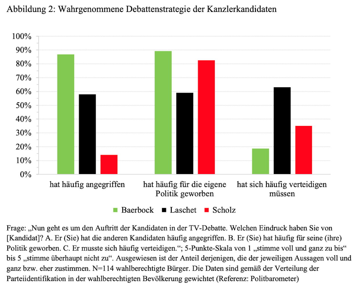 Laschet hat insbesondere im Vergleich zur zweiten Debatte seine Strategie geändert und versuchte nun, moderater aufzutreten. 58 Prozent der Befragten stimmten der Aussage zu, dass er seine Gegner häufig angegriffen hat. In der ersten Debatte waren dies 69 Prozent der Studienteilnehmer, in der zweiten Debatte 91 Prozent. Allerdings geriet er auch häufig in die Defensive: 63 Prozent stimmten der Aussage zu, dass er sich häufig verteidigen musste. „Dies ist eine mögliche Erklärung für sein schlechtes Abschneiden“, so Maier. Baerbock agierte wie gewohnt angriffslustig. Wie schon in der ersten Debatte gelang es Scholz, eine Amtsinhaberstrategie zu verfolgen: viel Werbung für die eigene Politik, wenige Angriffe auf den Gegner, nicht zu häufig im Verteidigungsmodus.