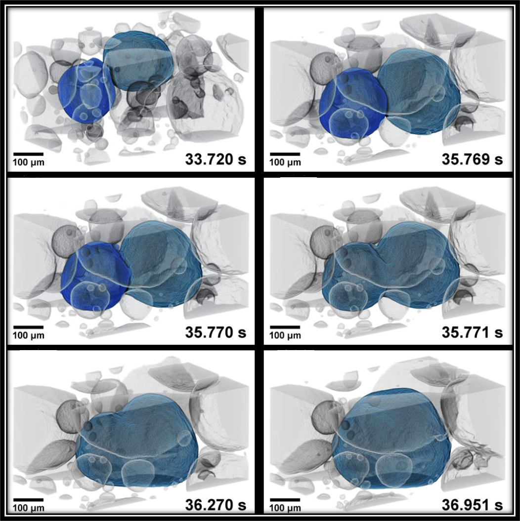 Die Leistungsfähigkeit der Tomoskopie demonstrierte das Team an verschiedenen Beispielen aus der Materialforschung: Die Aufnahmen zeigen die extrem schnellen Veränderungen beim Abbrennen einer Wunderkerze, die Bildung von Dendriten beim Erstarren von Gusslegierungen oder das Wachstum und die Koaleszenz von Blasen in einem flüssigen Metallschaum. Solche Metallschäume auf Basis von Aluminumlegierungen werden als Leichtbaumaterialien untersucht, zum Beispiel für den Bau von Elektroautos. Auf Morphologie, Größe und Vernetzung der Bläschen kommt es an, um die gewünschten mechanischen Eigenschaften wie Festigkeit und Steifigkeit in großen Bauteilen zu erreichen.