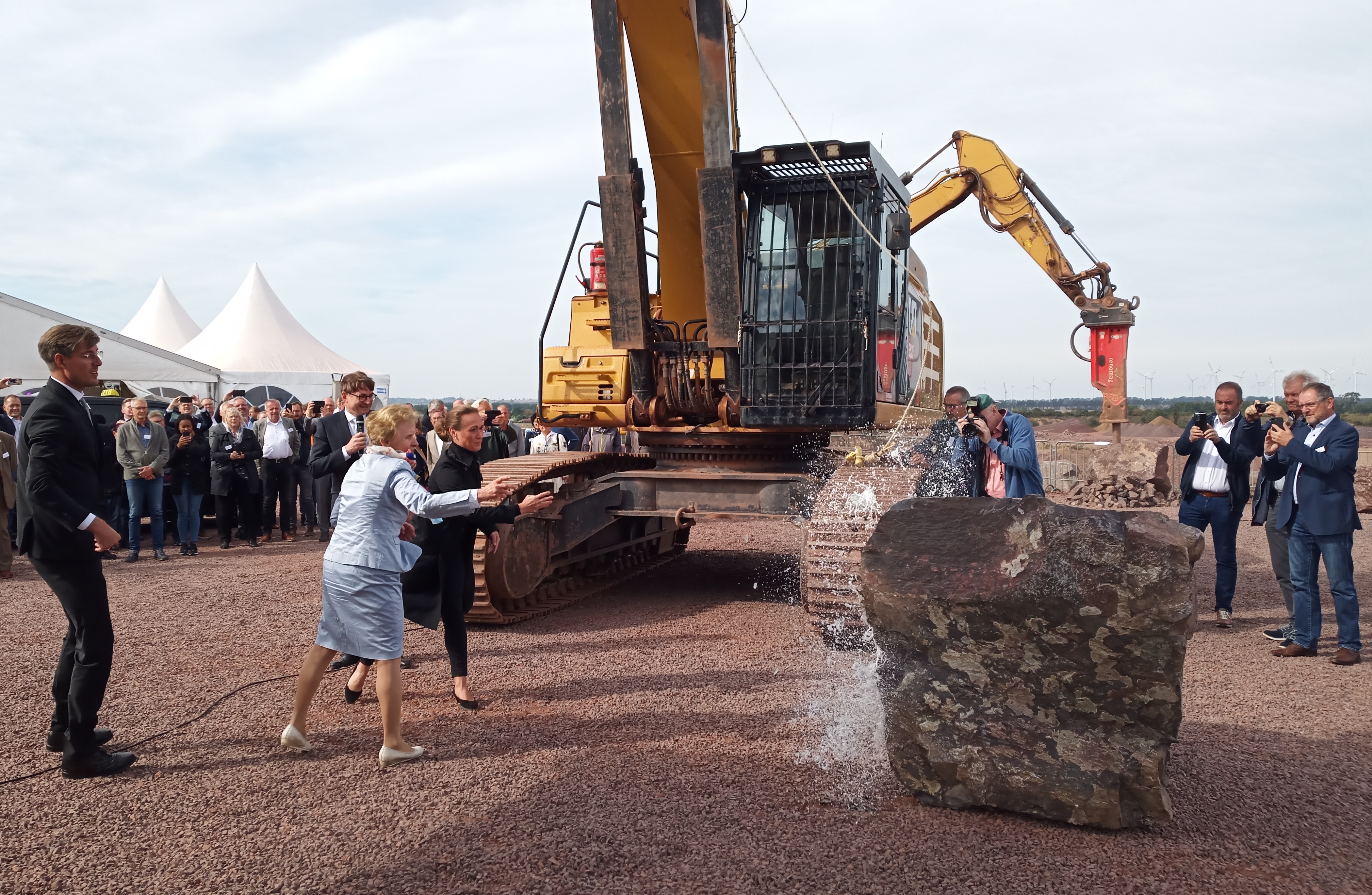 Der Festakt bot insgesamt eine spannende Begegnung mit Geowissenschaften, Rohstoffwirtschaft und Kultur. Feierlich „getauft“ wurde das Gestein des Jahres mit einer Flasche Sekt, die an einem gewaltigen Andesitbrocken zerschellte.
