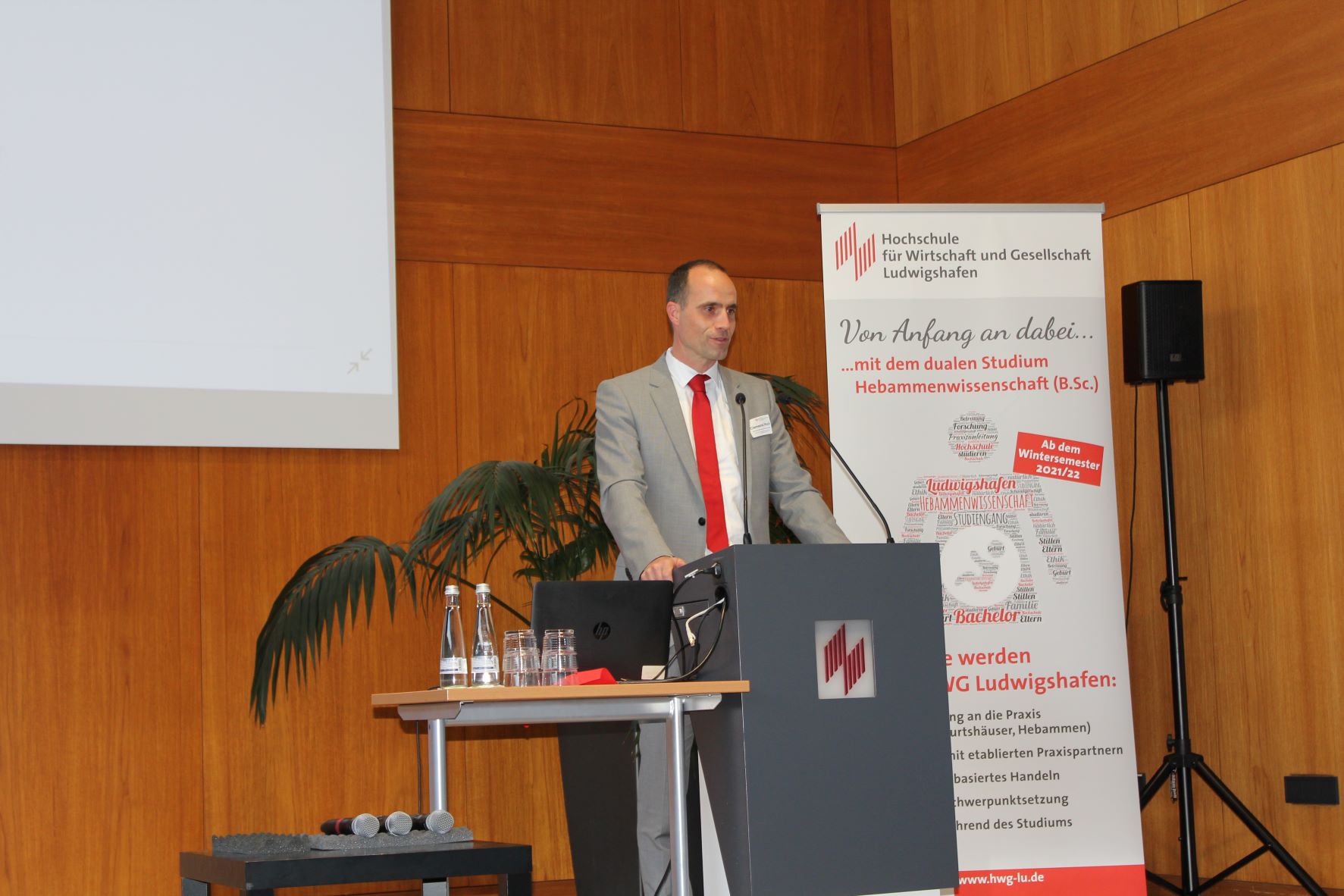 Clemens Hoch, Minister für Wissenschaft und Gesundheit des Landes Rheinland-Pfalz, überbrachte das Grußwort des Landes und lobte die Vorreiterrolle, die Ludwigshafen durch die frühe Etablierung des Studiengangs Hebammenwesen in der Akademisierung des Berufsstandes eingenommen habe ebenso wie die Konzeption des neuen Studiengangs „Hebammenwissenschaft“. Die Ergebnisse des Akkreditierungsrates zeigten deutlich, „welch gut durchdachtes Studienkonzept hier vorliegt“, so der Minister. „Die Akademisierung der Gesundheitsberufe zählt zu den besonders großen Herausforderungen in Deutschland. Umso besser, dass wir die Hochschule Ludwigshafen an unserer Seite haben. Wir wissen, dass wir auf ihre Erfahrung in der Lehre und praxisorientierten Forschung setzen können und auch auf ihre gewachsene ‚Community‘, ihren starken Verbund mit den Praxispartnern im Land und in Baden-Württemberg. Es sind Kliniken, die über langjährige profunde Erfahrungen in der Hebammenausbildung verfügen“, sagte der Minister.