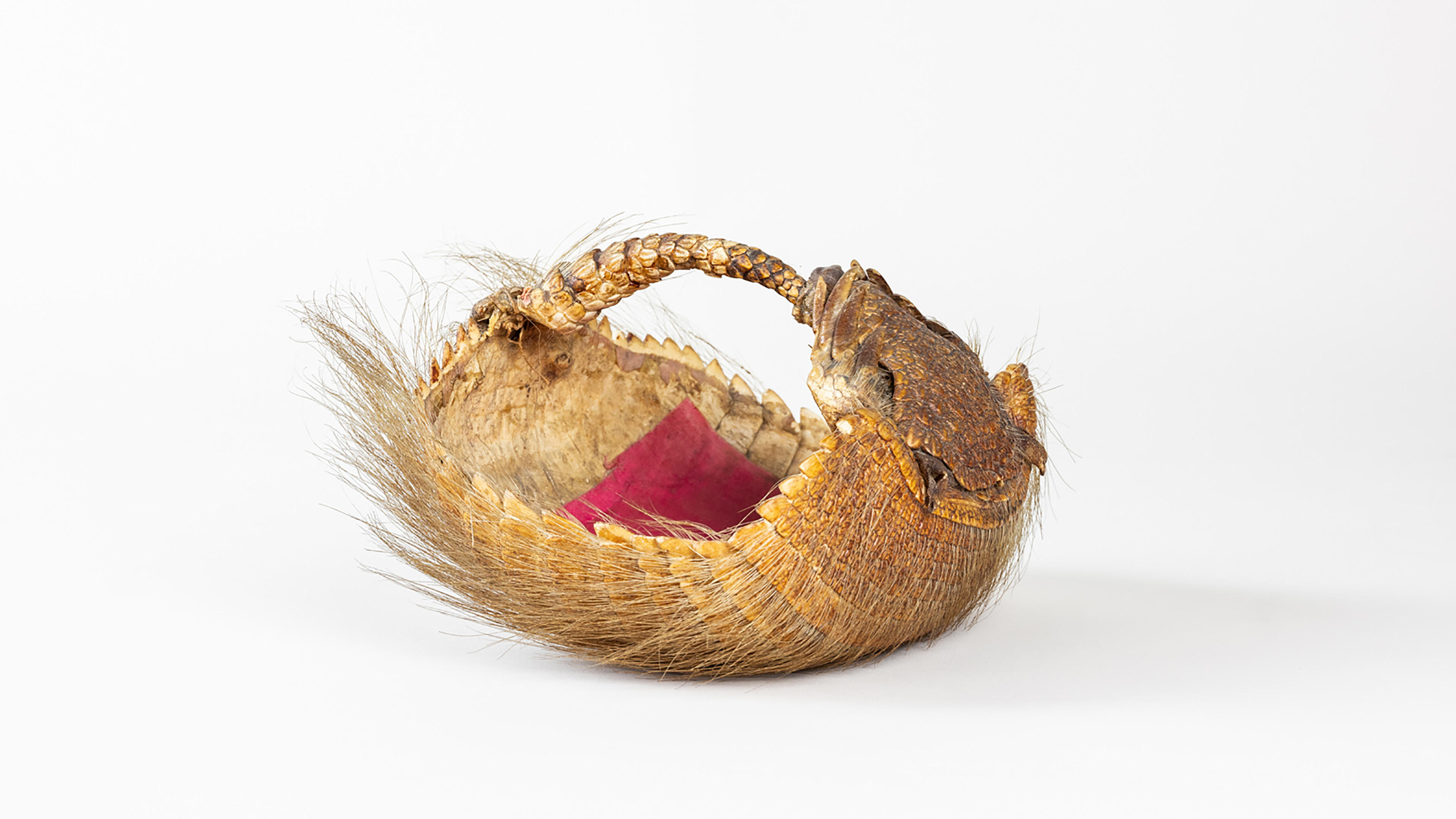A souvenir does not always tell the memories of the individual traveler associated with it. Some objects are produced and purchased in large quantities. The objects lay out false trails: They need to be looked at closely. Is an animal object like an armadillo shell or a fur-covered shield really just a souvenir, or is it instead an expression of a colonial power relationship? Sometimes the handing over or possession of such an object can be a substitute act for lost power or false memory. Does a wooden object from Papua New Guinea also serve as a neck rest in Europe? Things have left their cultural background. To learn their history, the context of their journey is reconstructed.