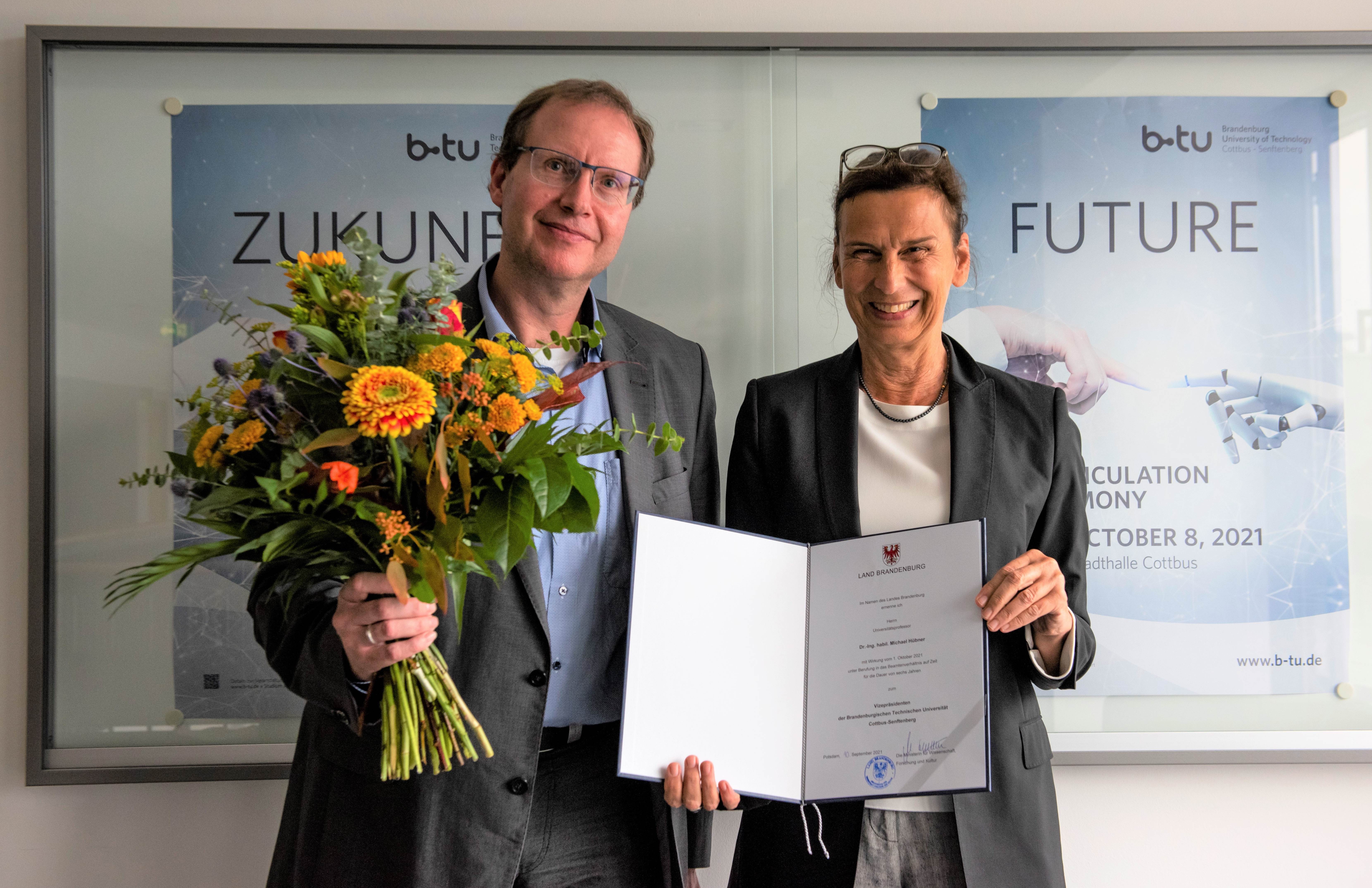 Bereits im Dezember 2020 wählte der akademische Senat der BTU Cottbus-Senftenberg Prof. Michael Hübner in das Amt des Vizepräsidenten für Forschung und Transfer. Im Juni 2021 wurde er einstimmig vom Senat als hauptberuflicher Vizepräsident und Vertreter der Präsidentin bestätigt. Mit der Ernennungsurkunde wurde diese Wahl nun für eine Amtszeit von sechs Jahren durch das Ministerium bestätigt.