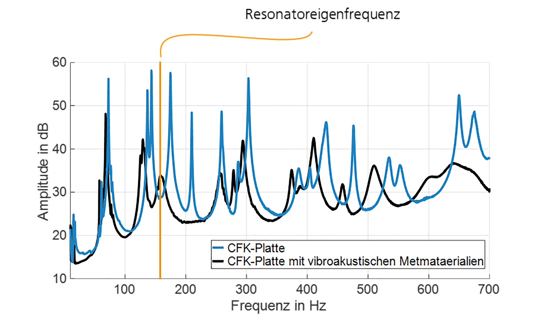Die experimentelle Umsetzung einer CFK-Probeplatte mit der Anwendung vibroakustischer Metamaterialien-Technologie zeigt ab der Resonatoreigenfrequenz von rund 150 Hz ein deutlich verbessertes Schwingungsverhalten. Dank der Anwendung eines hochgedämpften Materials für die Resonatoren wird das Schwingungsverhalten auch nach dem Stoppbandbereich optimiert. Die Schwingungsreduktion beträgt im erwarteten Stoppbandbereich bis 25 dB und im höheren Frequenzbereich (ab circa 250 Hz) bis 15 dB.