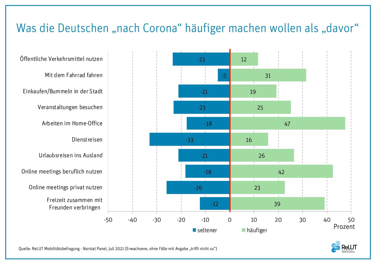 Mit der Corona-Pandemie änderte sich das Mobilitätsverhalten vieler Menschen. Diese Entwicklung untersuchte das ReLUT-Team im vergangenen Jahr in der Studie „Verkehrswende trotz Pandemie? Mobilität und Logistik während und nach der Corona-Krise“ von Juni bis September 2020. Dafür wertete es Verkehrsdaten aus unterschiedlichen Quellen aus, führte eine repräsentative Befragung von Bürgerinnen und Bürgern im Hinblick auf deren Verkehrsmittelwahl und Kaufverhalten durch und interviewte Expertinnen und Experten aus den Bereichen Wissenschaft, Verkehrswesen und Logistik zu den Herausforderungen, die sich durch die Corona-Pandemie ergeben. Daraus wurden Handlungsbedarfe und -empfehlungen für Verkehrspolitik und Verkehrsplanung abgeleitet. Ein Jahr später ist nun mithilfe einer zweiten Befragung der Bürger/-innen untersucht worden, wie sich Verkehrsmittelwahl und Mobilitätsverhalten tatsächlich geändert haben und was die Erwartungen für eine Zukunft „nach Corona“ sind. Gerade durch den Vergleich Geimpfter/Genesener auf der einen Seite und Ungeimpfter auf der anderen Seite, soll der Effekt der dauerhaften („post-Covid“) Verhaltensänderung abgeschätzt werden.