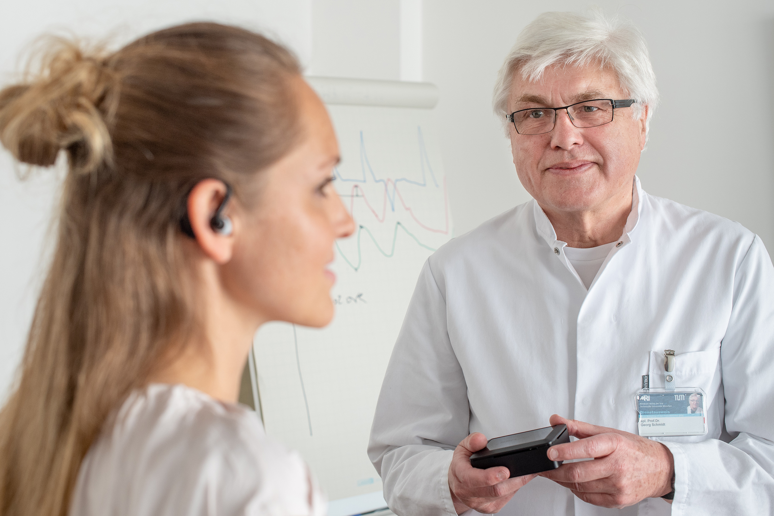 Während der zurückliegenden Corona-Wellen betreuten daher Georg Schmidt und sein Team über 150 Patienten und Patientinnen mit Risikofaktoren für einen schweren Verlauf telemedizinisch mit einem Ohrsensor, der ähnlich wie ein Hörgerät im Gehörgang getragen wird.