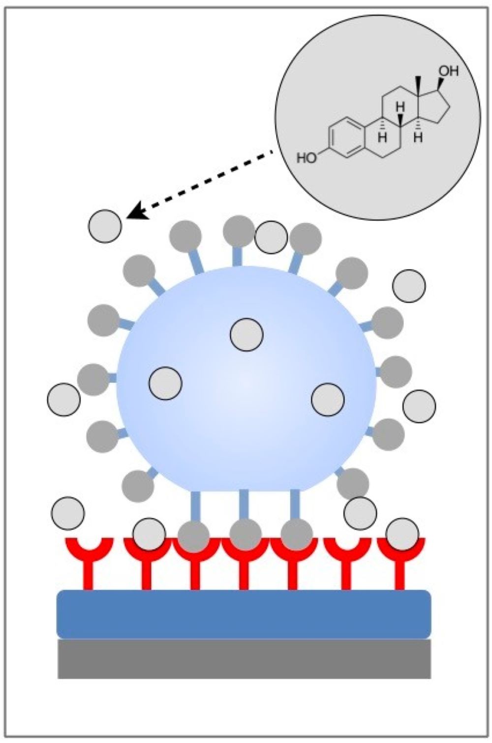 Bildbeschreibung: Schema des neuen Nachweisprinzips. Ein funktionalisierter Hydrogelmikropartikel (blaue Späre) bindet an das gerichtet immobilisierte Enzym (rot) auf einer Chip-Oberfläche. In Abhängigkeit der Anwesenheit von östrogenartigen Verbindungen (graue Sphären) in der Nachweislösung kommt es zur Blockierung dieser Bindungen und einer geringeren Deformation der Hydrogelmikropartikel, welche mit optischen Verfahren ausgelesen werden kann. Copyright: Rettke et al.