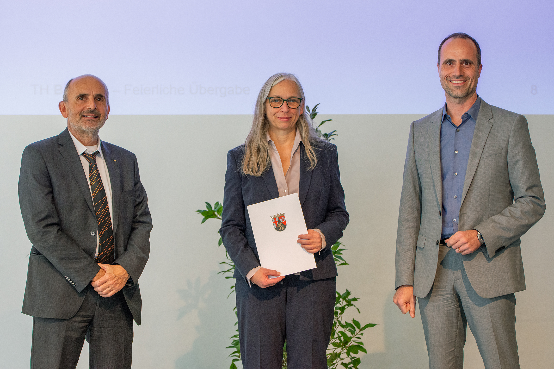 Seit dem 7. Oktober 2021 hat die Technische Hochschule (TH) Bingen eine neue Präsidentin: Prof. Dr. rer. nat. Antje Krause wurde auf der feierlichen Amtsübergabe in der Hochschule durch Wissenschaftsminister Clemens Hoch die Ernennungsurkunde überreicht. Prof. Krause, die bereits im Mai vom Senat der Hochschule gewählt wurde, ist die Nachfolgerin von Prof. Dr.-Ing. Klaus Becker. Becker ist Professor für Werkstofftechnik und hatte die Präsidentschaft für zwei Amtszeiten inne. Er verabschiedet sich nun nach zwölf Jahren und geht demnächst in den Ruhestand.