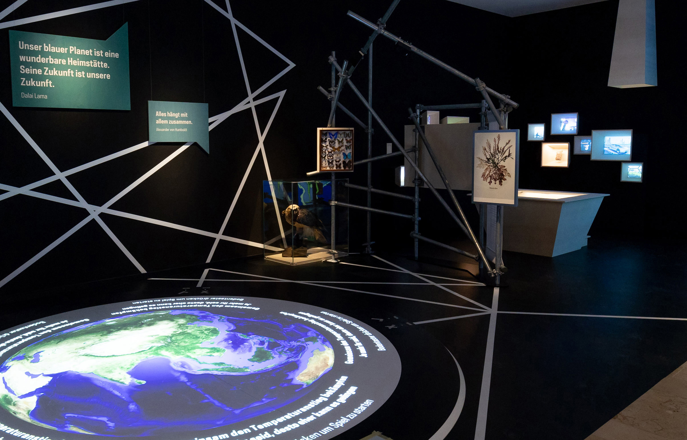 „Für die Umsetzung der Inhalte der Ausstellung in einen BersucherInnen-Parcours in den historischen Räumen von Schloss Rosenstein haben wir ein Baugerüst als nachhaltiges Ausstellungssystem gewählt. Unterschiedliche Ausstellungselemente ermöglichen eigene Zugänge zu den Themen: Großgrafiken mit plakativen Fakten geben einen schnellen Überblick, Reflexionsräume laden zum Weiterdenken ein, Visionskästen mit künstlerischen Dioramen ermöglichen einen Zugang zu neuesten Forschungsergebnissen“, so Dipl.-Des. Catherine François, eine der verantwortlichen Ausstellungsgestalterinnen vom Stuttgarter Büro raumhochn.