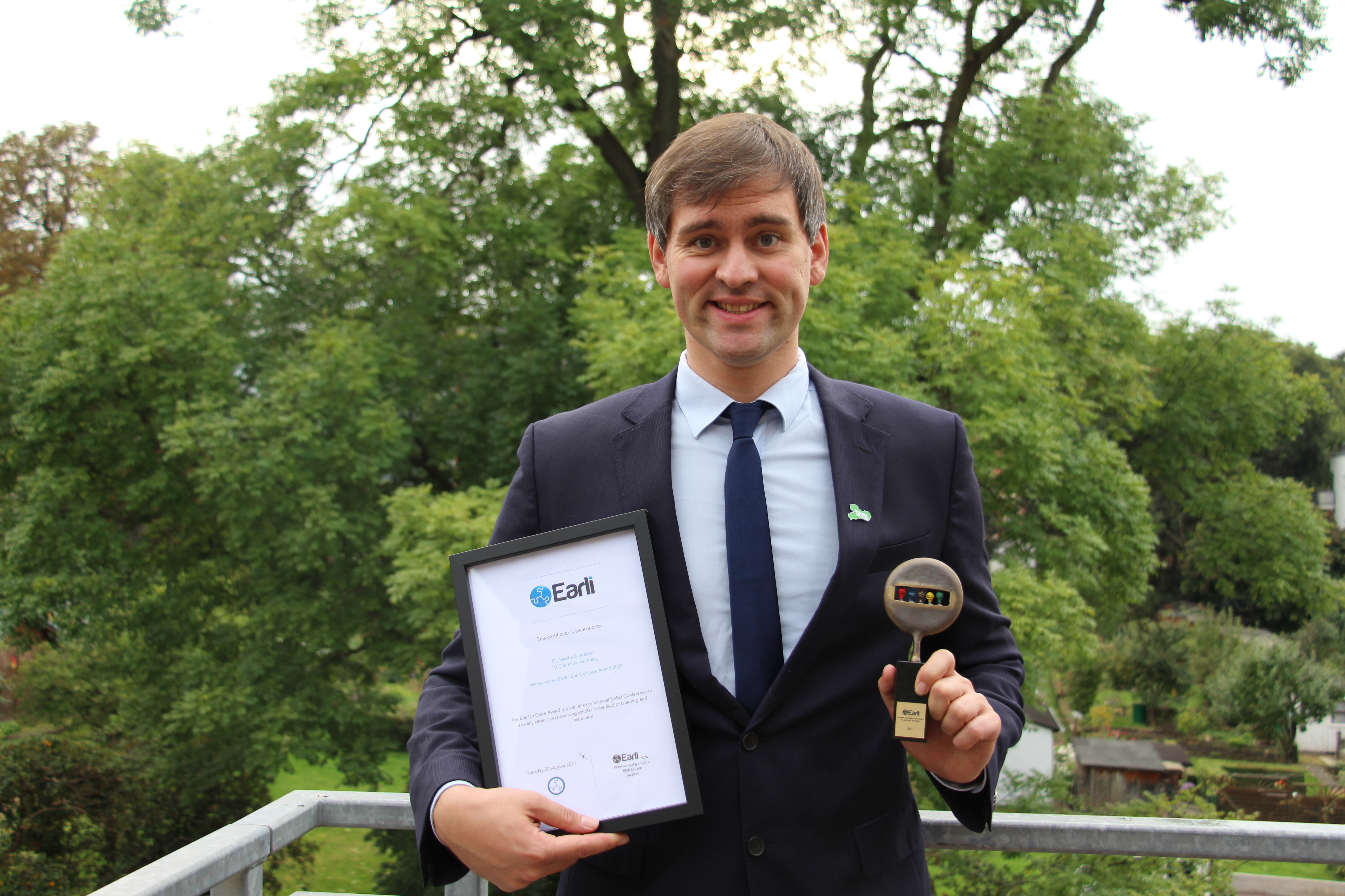Dr. Sascha Schneider, Wissenschaftlicher Mitarbeiter an der Professur Psychologie digitaler Lernmedien (Leitung: Prof. Dr. Günter Daniel Rey) der Technischen Universität Chemnitz, erhielt im Rahmen der internationalen 19th Biennial EARLI Conference den „Eric-de-Corte-Award“. Damit wird eine herausragende Forschungsarbeit eines Nachwuchswissenschaftlers beziehungsweise einer Nachwuchswissenschaftlerin alle zwei Jahre im Bereich „Digitales Lehren und Lernen“ ausgezeichnet. Schneiders Arbeit setzte sich zuvor in der Begutachtung durch drei unabhängige Prüferinnen und Prüfer mit der höchsten Durchschnittsbewertung durch.