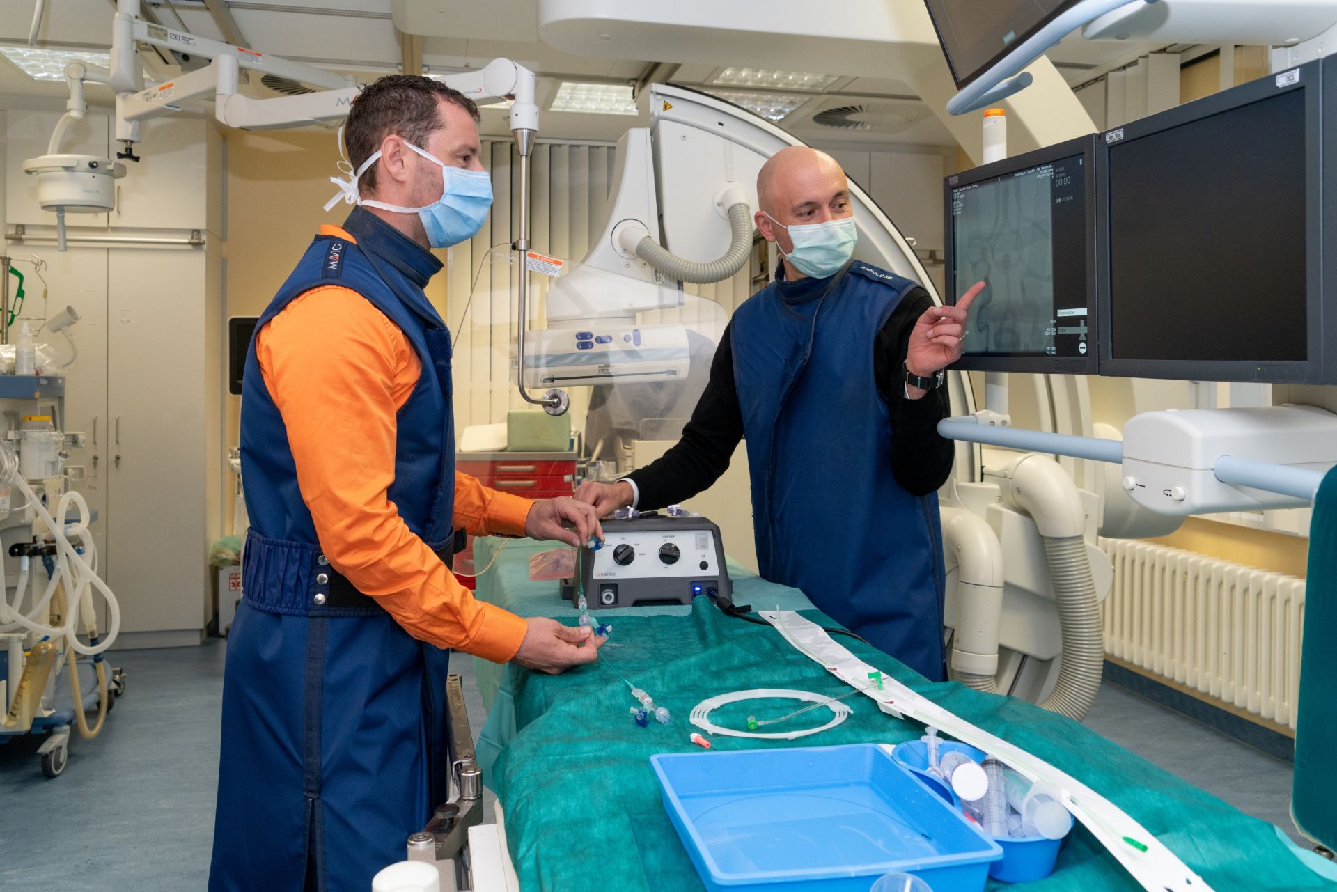 Bei dem Dresdner Hands-on-Kurs wird in Kleingruppen an modernsten Angiographiesimulatoren und an Flussmodellen im Katheterlabor trainiert. Hierbei lernen die Teilnehmerinnen und Teilnehmer die auch in der Behandlung verwendeten Materialien und Geräte sowie deren korrekte Anwendung kennen. „Unser Ziel ist es, dass die Teilnehmenden des Kurses die Grundzüge der Thrombektomie zunächst im Simulator üben, bevor sie mit ihren erlernten Fähigkeiten erstmals Patienten behandeln“, sagt PD Dr. Gawlitza. In erste Linie rekrutieren sich die Teilnehmenden dieser Kurse aus dem ärztlichen Nachwuchs solcher Kliniken, die über die notwendige Infrastruktur verfügen und bestehende Teams ausbauen möchten. In dem Setting des Kurses werden diese Ärztinnen und Ärzte von erfahrenen Spezialistinnen und Spezialisten anhand praxisnaher Simulatoren geschult. Dabei diskutieren sie auch konkrete Behandlungsfälle um die Gefahren und Probleme aufzuzeigen, die mit diesem Eingriff verbunden sind.