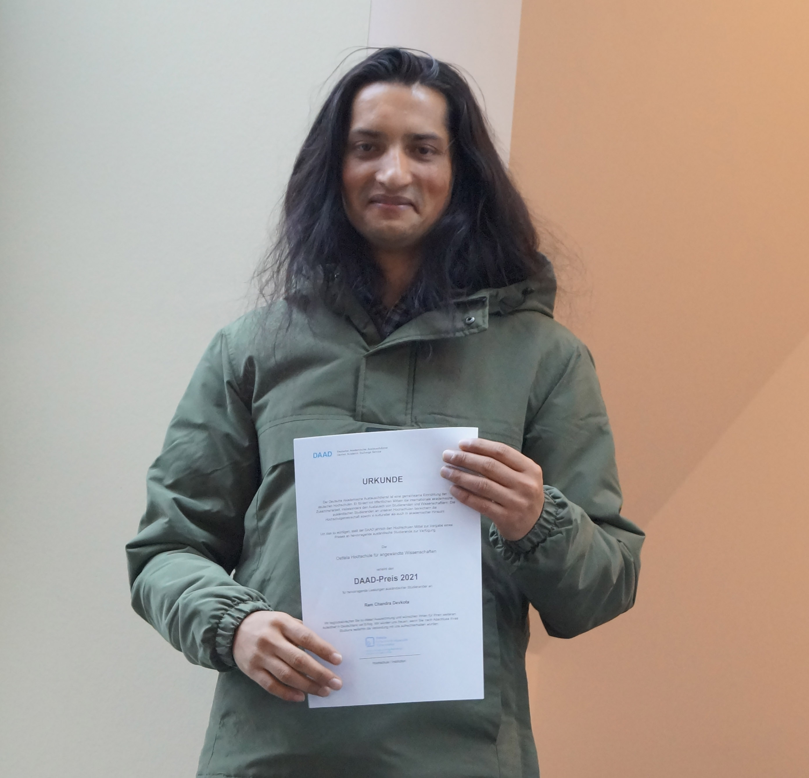 Ram Chandra Devkota aus Nepal ist der Preisträger des diesjährigen DAAD-Preises, einer mit 1.000 Euro dotierten Anerkennung besonderer akademischer und sozialer Leistungen ausländischer Studierender in Deutschland, die jährlich vom Deutschen Akademischen Austauschdienst (DAAD) bereitgestellt und durch die Hochschulen vergeben wird.