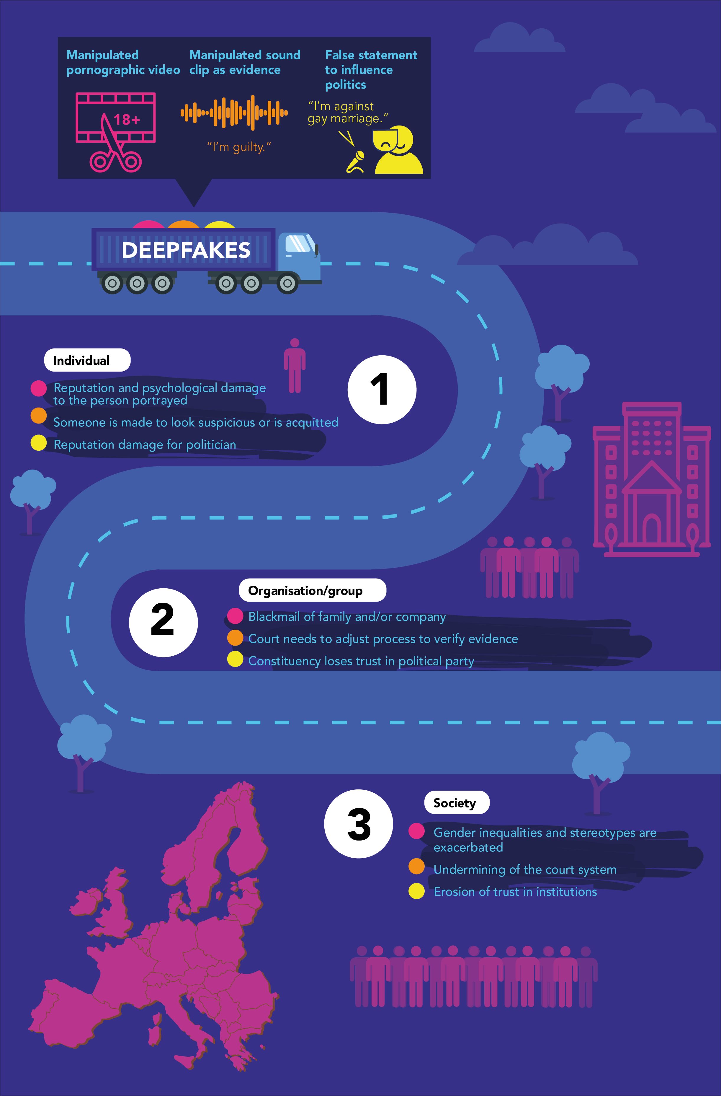 Gleichzeitig bringen Deepfakes jedoch erhebliche Gefahren mit sich, wie die jetzt vorgestellte internationale Studie für den STOA-Ausschuss (steht für Scientific Technology Options Assessment) des Europäischen Parlaments zeigt. „Die Technologie kann missbraucht werden, um sehr effektiv Fake News und Desinformationen zu streuen“, so Jahnel, die den Beitrag des ITAS zur Studie koordiniert hat. So könnten gefälschte Audiodokumente dafür eingesetzt werden, juristische Prozesse zu beeinflussen oder in Misskredit zu bringen, und letztlich das Justizsystem bedrohen. Möglich wäre beispielsweise auch, mit einem fingierten Video einer Politikerin nicht nur persönlich zu schaden, sondern damit auch die Wahlchancen ihrer Partei zu beeinflussen und in letzter Konsequenz dem Vertrauen in demokratische Institutionen insgesamt zu schaden.