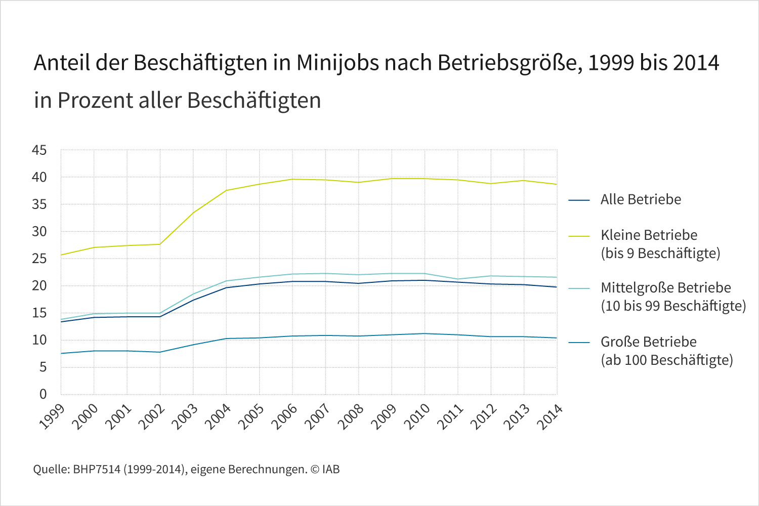 Insgesamt nutzten rund 20 Prozent aller Betriebe im Jahr 2014 Minijobs. Allerdings gibt es erhebliche Unterschiede zwischen Betrieben unterschiedlicher Größe. So waren im Jahr 2014 im Durchschnitt fast 40 Prozent der Belegschaft in kleinen Betrieben in Minijobs beschäftigt, während der Anteil bei großen Betrieben rund 10 Prozent betrug. Insgesamt entfallen auf kleine Betriebe 15 Prozent aller sozialversicherungspflichtigen und 36 Prozent aller geringfügigen Beschäftigungsverhältnisse.