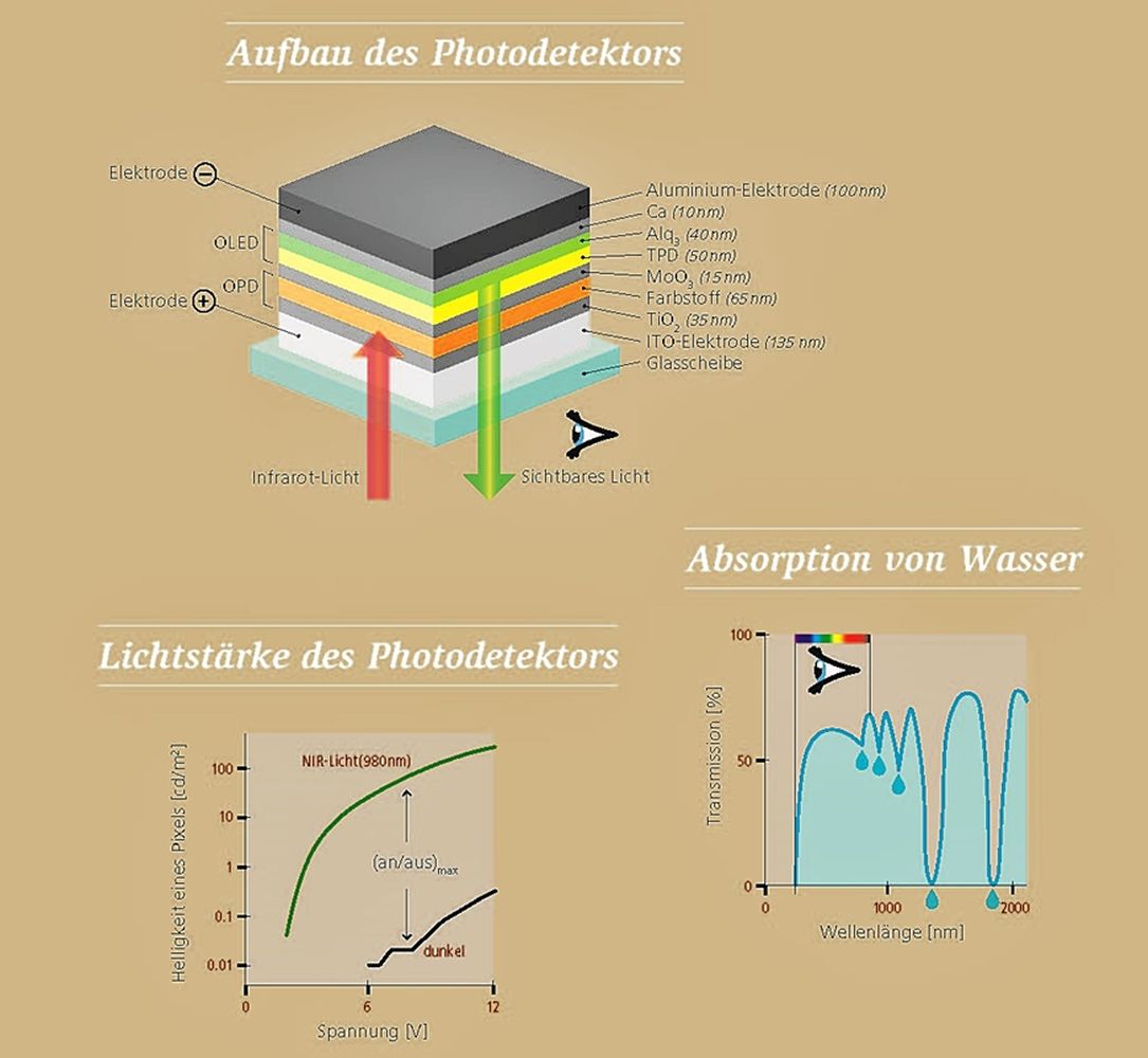 Den Empa-Forschern Roland Hany, Karen Strassel, Wei-Hsu und Michael Bauer ist es nun gelungen, SWIR-Licht mit einem einzigen Bauteil einzufangen und sichtbar zu machen. Der an der Empa entwickelte Baustein ist im Grunde ein OLED-Display mit drei weiteren Zusatzschichten (siehe Grafik). Das SWIR-Licht fällt durch eine elektrisch leitfähige Glasscheibe auf eine Farbstoffschicht in einem Photodetektor. Dort beginnen Elektronen zu wandern – diese Wanderungsbewegung wird durch eine elektrische Spannung verstärkt. Die elektrischen Ladungen wandern dann in die OLED-Schicht und erzeugen dort einen grünen Lichtpunkt. Eine elektronische Signalverarbeitung durch einen Rechner ist nicht nötig: Das einfallende (unsichtbare) SWIR-Licht wird gewissermassen «analog» verstärkt und direkt auf dem Bildschirm angezeigt. Die Farbe des emittierten sichtbaren Lichts – blau, grün, gelb oder rot – lässt sich durch die Wahl des Farbstoffs in der OLED einstellen.