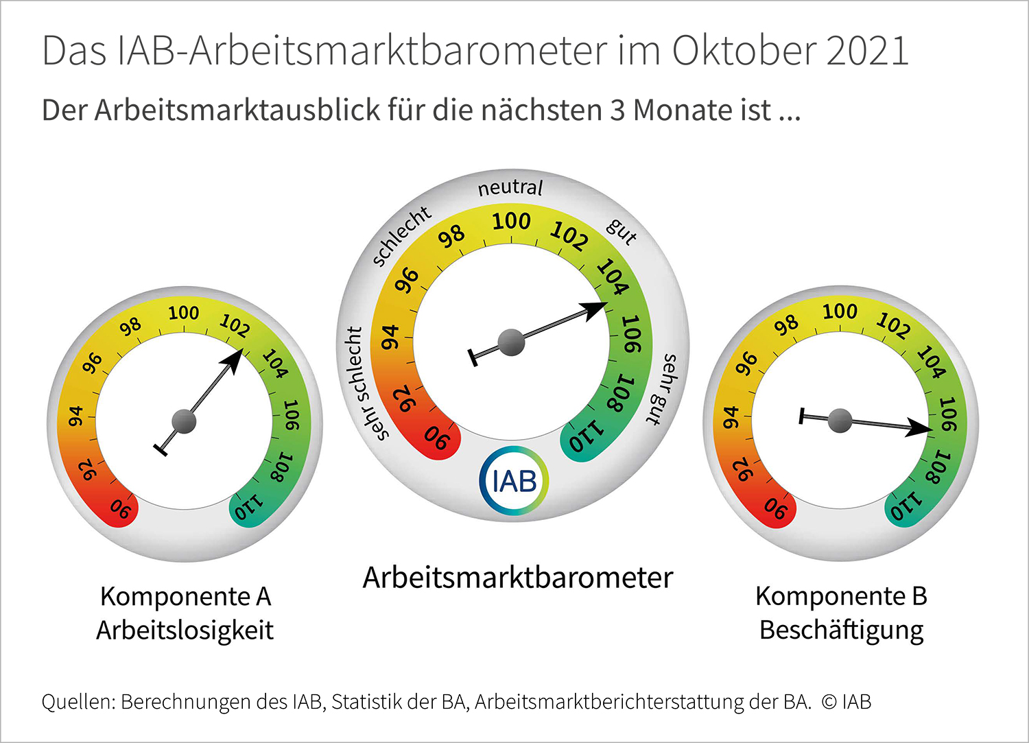 Das IAB-Arbeitsmarktbarometer ist ein seit November 2008 bestehender Frühindikator, der auf einer monatlichen Umfrage der Bundesagentur für Arbeit unter allen lokalen Arbeitsagenturen basiert. Während Komponente A des Barometers die Entwicklung der saisonbereinigten Arbeitslosenzahlen für die nächsten drei Monate prognostiziert, dient Komponente B der Vorhersage der Beschäftigungsentwicklung. Der Mittelwert aus den Komponenten „Arbeitslosigkeit“ und „Beschäftigung“ bildet den Gesamtwert des IAB-Arbeitsmarktbarometers. Dieser Indikator gibt damit einen Ausblick auf die Gesamtentwicklung des Arbeitsmarkts. Da das Saisonbereinigungsverfahren laufend aus den Entwicklungen der Vergangenheit lernt, kann es zu nachträglichen Revisionen kommen. Die Skala des IAB-Arbeitsmarktbarometers reicht von 90 (sehr schlechte Entwicklung) bis 110 (sehr gute Entwicklung).