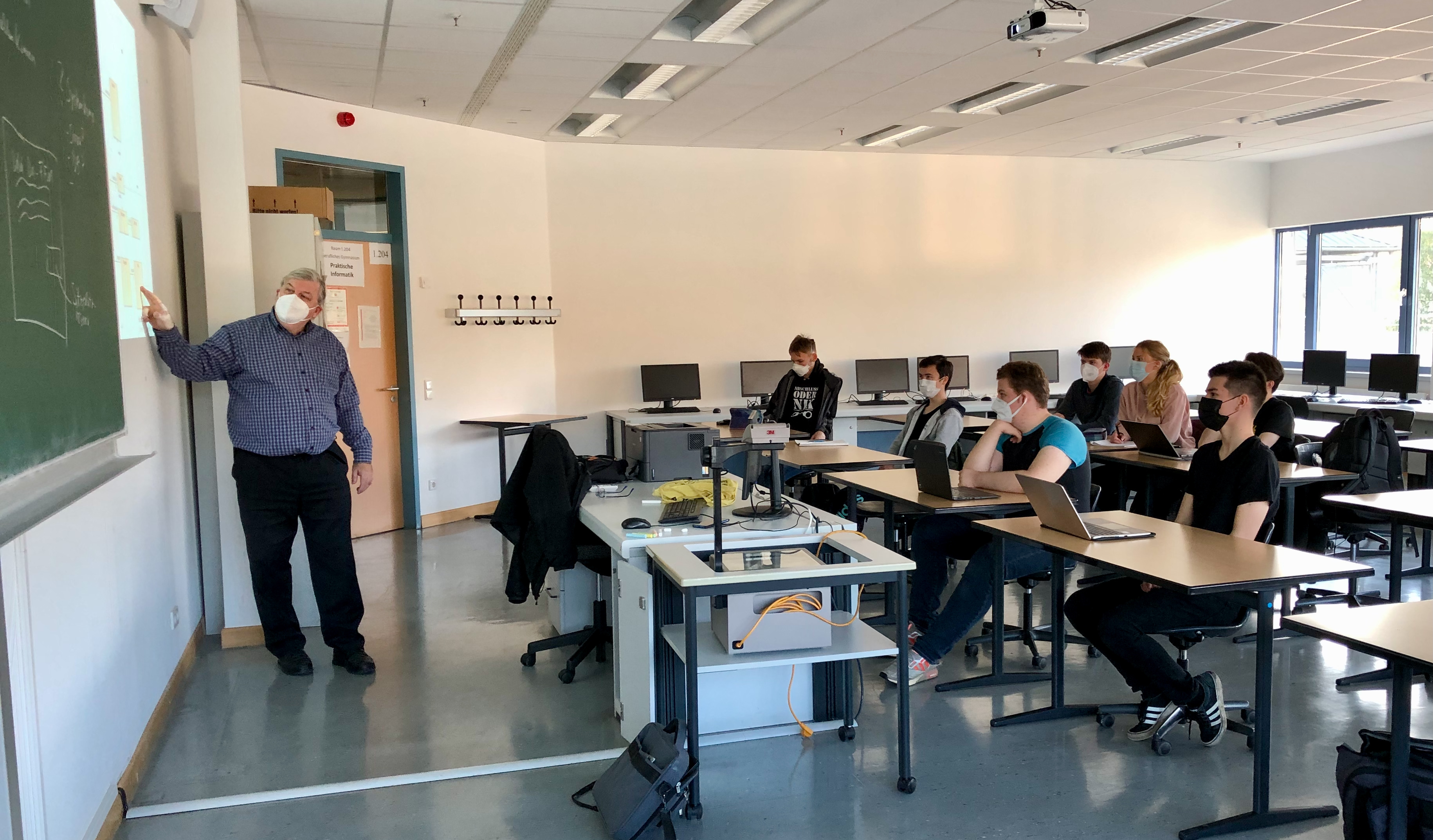 Damit das Curriculum an Hochschule und Schule Hand in Hand geht, vernetzen sich Prof. Dr. Frank Bühler und Claus Endreß, Informatik-Lehrer und Abteilungsleiter des Beruflichen Gymnasiums an der Hochtaunusschule, kontinuierlich. Im inhaltlichen Fokus stehen vielfältige Themen der technischen und praktischen Informatik. Professor Bühler besucht regelmäßig die Oberurseler Informatik-Klasse, zugleich haben die Schülerinnen und Schüler die Gelegenheit, die Hochschule Darmstadt kennenzulernen. Bei den Prüfungen an der h_da ist Lehrer Claus Endreß anwesend.